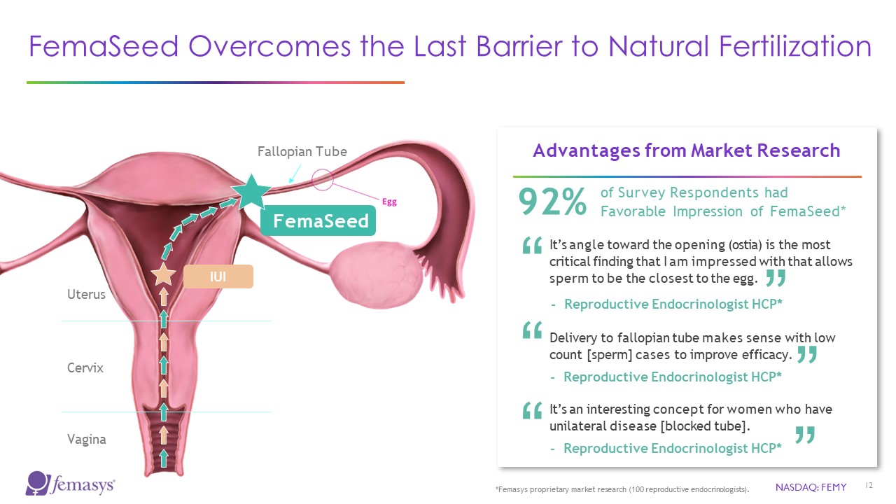 Delivers sperm to site of conception  NO CATHETERIZATION  Video will open in browser window.  Intended Population:  Infertile women/ couples  Patients desiring insemination, including same sex couples & single women  NASDAQ: FEMY  11  Requires at least one open fallopian tube  (FemVue can confirm first)  Safe  Cost-Effective   Enhance Fertilization  Infertility Portfolio: from Diagnosis to Treatment