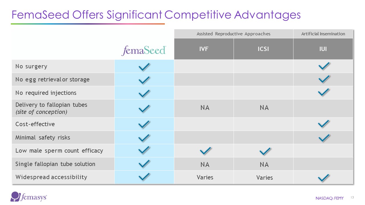Vagina  Cervix  Uterus  FemaSeed  IUI  Fallopian Tube  NASDAQ: FEMY  12  *Femasys proprietary market research (100 reproductive endocrinologists).  Advantages from Market Research  92%  of Survey Respondents had Favorable Impression of FemaSeed*  ”  It’s angle toward the opening (ostia) is the most  critical finding that I am impressed with that allows  sperm to be the closest to the egg.  - Reproductive Endocrinologist HCP*  ”  It’s an interesting concept for women who have  unilateral disease [blocked tube].  - Reproductive Endocrinologist HCP*  Delivery to fallopian tube makes sense with low  “  “  “  ”  count [sperm] cases to improve efficacy.  - Reproductive Endocrinologist HCP*  FemaSeed Overcomes the Last Barrier to Natural Fertilization
