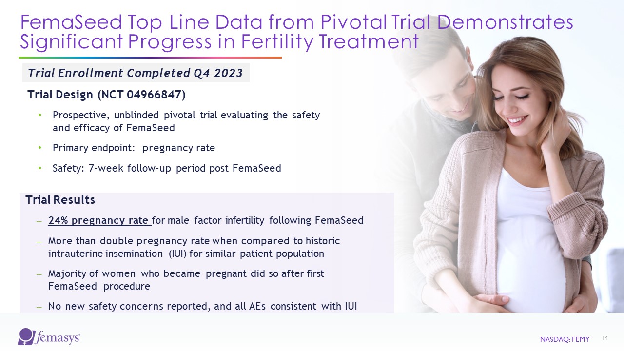 FemaSeed Offers Significant Competitive Advantages  NASDAQ: FEMY  13  Assisted Reproductive Approaches  Artificial Insemination  IVF  ICSI  IUI  No surgery  No egg retrieval or storage  No required injections  Delivery to fallopian tubes (site of conception)  NA  NA  Cost-effective  Minimal safety risks  Low male sperm count efficacy  Single fallopian tube solution  NA  NA  Widespread accessibility  Varies  Varies