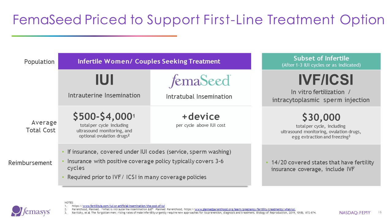 NASDAQ: FEMY  16  FemaSeed Priced to Support First-Line Treatment Option  Infertile Women/ Couples Seeking Treatment  IUI  Intrauterine Insemination   Intratubal Insemination  $500-$4,0001  total per cycle including ultrasound monitoring, and optional ovulation drugs2  + device  per cycle above IUI cost  If insurance, covered under IUI codes (service, sperm washing)  Insurance with positive coverage policy typically covers 3-6 cycles  Required prior to IVF/ ICSI in many coverage policies  Subset of Infertile  (After 1-3 IUI cycles or as indicated)  IVF/ICSI  In vitro fertilization / intracytoplasmic sperm injection  $30,000  total per cycle, including ultrasound monitoring, ovulation drugs,  egg extraction and freezing3  14/20 covered states that have fertility insurance coverage, include IVF  Population  Average Total Cost  Reimbursement  NOTES:  https://www.fertilityiq.com/iui-or-artificial-insemination/the-cost-of-iui  Parenthood, Planned. “What Is Intrauterine Insemination (IUI)?” Planned Parenthood, https://www.plannedparenthood.org/learn/pregnancy/fertility-treatments/what-iui.  Ravitsky, et al. The forgotten men: rising rates of male infertility urgently require new approaches for its prevention, diagnosis and treatment. Biology of Reproduction, 2019, 101(5), 872-874.