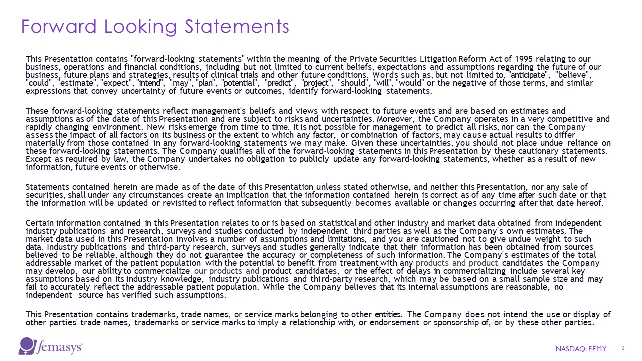 This Presentation contains "forward-looking statements" within the meaning of the Private Securities Litigation Reform Act of 1995 relating to our business, operations and financial conditions, including but not limited to current beliefs, expectations and assumptions regarding the future of our business, future plans and strategies, results of clinical trials and other future conditions. Words such as, but not limited to, "anticipate", "believe", "could", "estimate", "expect", "intend", "may", "plan", "potential", "predict", "project", "should", "will", "would" or the negative of those terms, and similar expressions that convey uncertainty of future events or outcomes, identify forward-looking statements.  These forward-looking statements reflect management's beliefs and views with respect to future events and are based on estimates and assumptions as of the date of this Presentation and are subject to risks and uncertainties. Moreover, the Company operates in a very competitive and rapidly changing environment. New risks emerge from time to time. It is not possible for management to predict all risks, nor can the Company assess the impact of all factors on its business or the extent to which any factor, or combination of factors, may cause actual results to differ materially from those contained in any forward-looking statements we may make. Given these uncertainties, you should not place undue reliance on these forward-looking statements. The Company qualifies all of the forward-looking statements in this Presentation by these cautionary statements. Except as required by law, the Company undertakes no obligation to publicly update any forward-looking statements, whether as a result of new information, future events or otherwise.  Statements contained herein are made as of the date of this Presentation unless stated otherwise, and neither this Presentation, nor any sale of securities, shall under any circumstances create an implication that the information contained herein is correct as of any time after such date or that the information will be updated or revisited to reflect information that subsequently becomes available or changes occurring after that date hereof.  Certain information contained in this Presentation relates to or is based on statistical and other industry and market data obtained from independent industry publications and research, surveys and studies conducted by independent third parties as well as the Company's own estimates. The market data used in this Presentation involves a number of assumptions and limitations, and you are cautioned not to give undue weight to such data. Industry publications and third-party research, surveys and studies generally indicate that their information has been obtained from sources believed to be reliable, although they do not guarantee the accuracy or completeness of such information. The Company's estimates of the total addressable market of the patient population with the potential to benefit from treatment with any products and product candidates the Company may develop, our ability to commercialize our products and product candidates, or the effect of delays in commercializing include several key assumptions based on its industry knowledge, industry publications and third-party research, which may be based on a small sample size and may fail to accurately reflect the addressable patient population. While the Company believes that its internal assumptions are reasonable, no independent source has verified such assumptions.  This Presentation contains trademarks, trade names, or service marks belonging to other entities. The Company does not intend the use or display of other parties' trade names, trademarks or service marks to imply a relationship with, or endorsement or sponsorship of, or by these other parties.  NASDAQ: FEMY  2  Forward Looking Statements