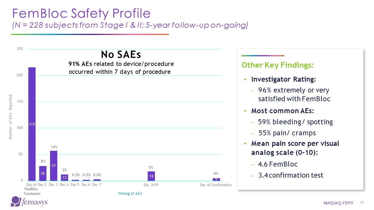FemBloc Clinical Studies for Pre-Market Approval (PMA)  Stage III: FINALE Pivotal Clinical Trial  Trial Design (IDE approved June 2023; currently enrolling)  Prospective, multi-center, open-label, single-arm study  ⎼ Roll-in study design (50 subjects in part A for safety)  ⎼ Endpoints:  Primary: pregnancy rate at 1-year after using FemBloc (N=401)  Secondary: safety and various in-office assessments  Additional Analysis:  ⎼ 2-5 years post-market for safety  ⎼ Interim analysis: after 300 women have relied on FemBloc for 1-year  Completed Earlier FemBloc Supportive Studies (N=321)  Early Clinical (N=93)  Stage I: Safety (N=183); IDE approved  Stage II: Validation (N=45); IDE approved  Evaluated Delivery & Biopolymer  No Serious AEs Reported; 5-year follow-up for safety  Selection of Confirmation Test for Pivotal; 5-year follow-up for safety  NASDAQ: FEMY  21