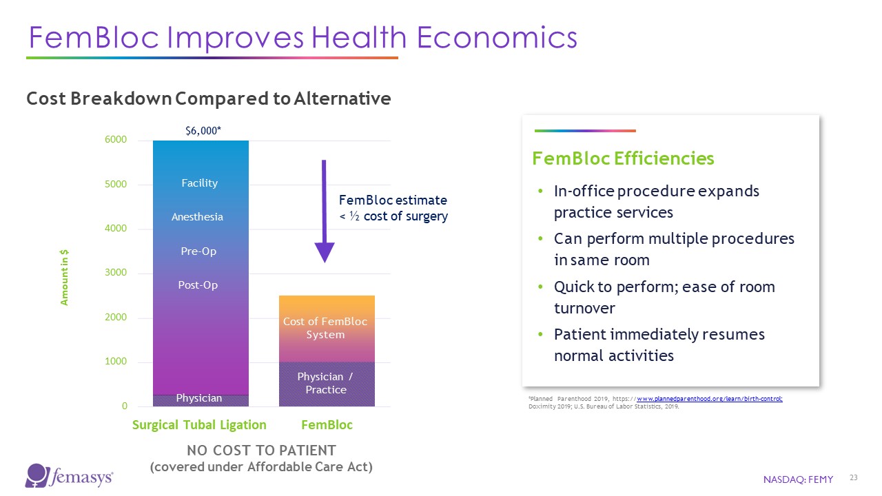FemBloc Improves Health Economics  0  1000  2000  3000  4000  5000  6000  Cost Breakdown Compared to Alternative  $6,000*  Amount in $  Pre-Op  Facility  Anesthesia  Post-Op  Cost of FemBloc System  Anesthe  Physician / Practice  FemBloc estimate  < ½ cost of surgery  Physician  Surgical Tubal Ligation FemBloc  NO COST TO PATIENT  (covered under Affordable Care Act)  FemBloc Efficiencies  In-office procedure expands practice services  Can perform multiple procedures in same room  Quick to perform; ease of room turnover  Patient immediately resumes normal activities  *Planned Parenthood 2019, https://www.plannedparenthood.org/learn/birth-control; Doximity 2019; U.S. Bureau of Labor Statistics, 2019.  NASDAQ: FEMY  23