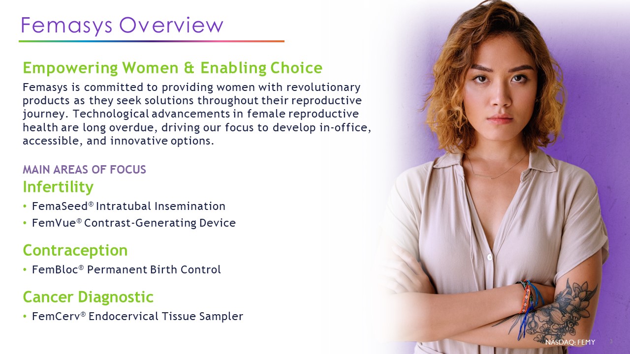 Femasys Overview  NASDAQ: FEMY  3  Empowering Women & Enabling Choice  Femasys is committed to providing women with revolutionary products as they seek solutions throughout their reproductive journey. Technological advancements in female reproductive health are long overdue, driving our focus to develop in-office, accessible, and innovative options.  MAIN AREAS OF FOCUSInfertility  FemaSeed® Intratubal Insemination  FemVue® Contrast-Generating Device  Contraception  FemBloc® Permanent Birth Control  Cancer Diagnostic  FemCerv® Endocervical Tissue Sampler