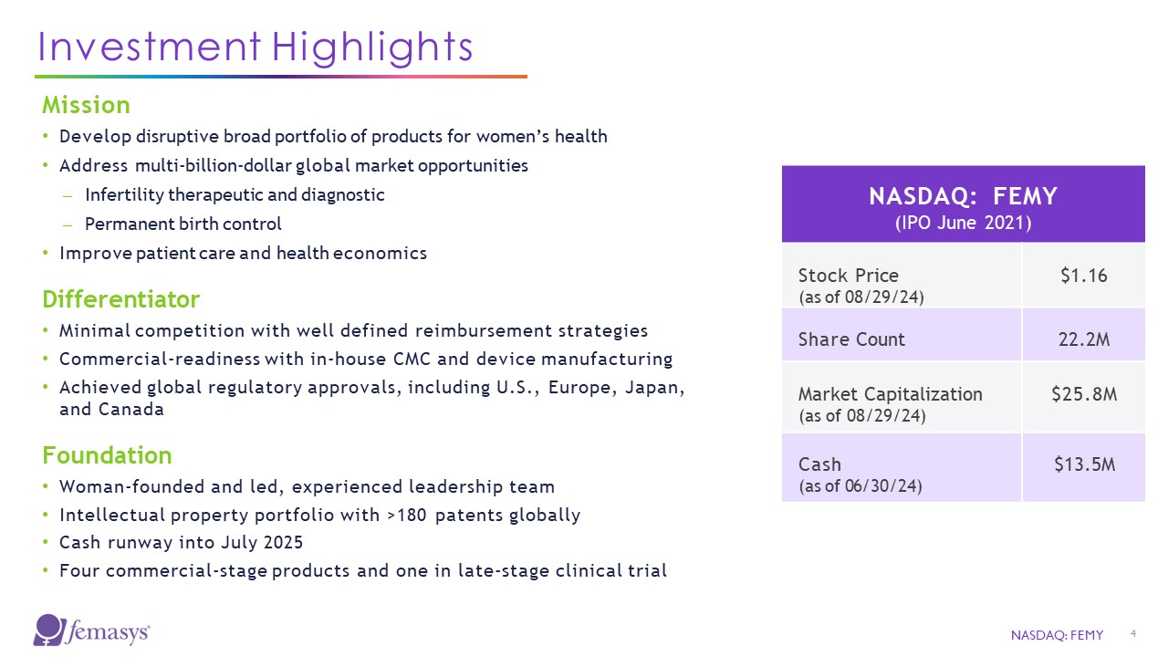 Investor presentation  August 2024  NASDAQ: FEMY  Disrupting Convention in Women’s Reproductive Health Through Continuous Innovation