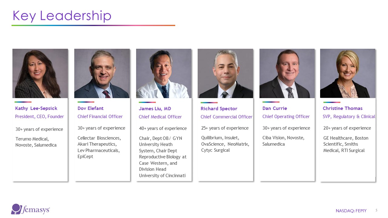 Key Leadership  Kathy Lee-Sepsick  President, CEO, Founder  30+ years of experience  Terumo Medical, Novoste, Salumedica  Dov Elefant  Chief Financial Officer  30+ years of experience  Cellectar Biosciences, Akari Therapeutics, Lev Pharmaceuticals, EpiCept  James Liu, MD  Chief Medical Officer  40+ years of experience  Chair, Dept OB/ GYN University Heath System, Chair Dept Reproductive Biology at Case Western, and Division Head University of Cincinnati  Richard Spector  Chief Commercial Officer  25+ years of experience  Quilibrium, Insulet, OvaScience, NeoMatrix, Cytyc Surgical  Dan Currie  Chief Operating Officer  30+ years of experience  Ciba Vision, Novoste, Salumedica  Christine Thomas  SVP, Regulatory & Clinical  20+ years of experience  GE Healthcare, Boston Scientific, Smiths Medical, RTI Surgical  NASDAQ: FEMY  5