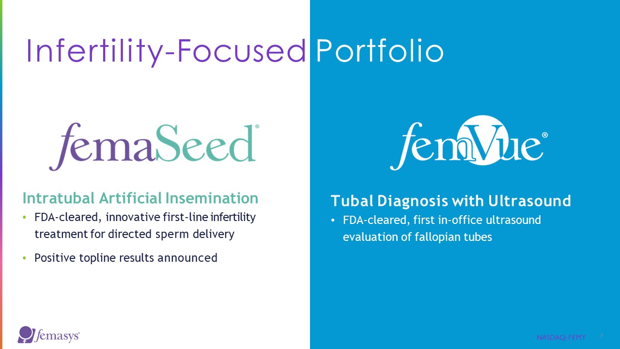 Commercially Available Products  Treatment  Intratubal Insemination  Diagnostic  Contrast-Generating Device  Diagnostic  Selective Delivery Catheter  Diagnostic  Endocervical Tissue Sampler  Office-based, minimally invasive solutions utilizing shared delivery platforms  Product Candidate  Research Preclinical  Stage I  Safety  Clinical Trial  Stage II  Validation  Stage III  Pivotal  NASDAQ: FEMY  6  Solutions for Women Through the Continuum of Care