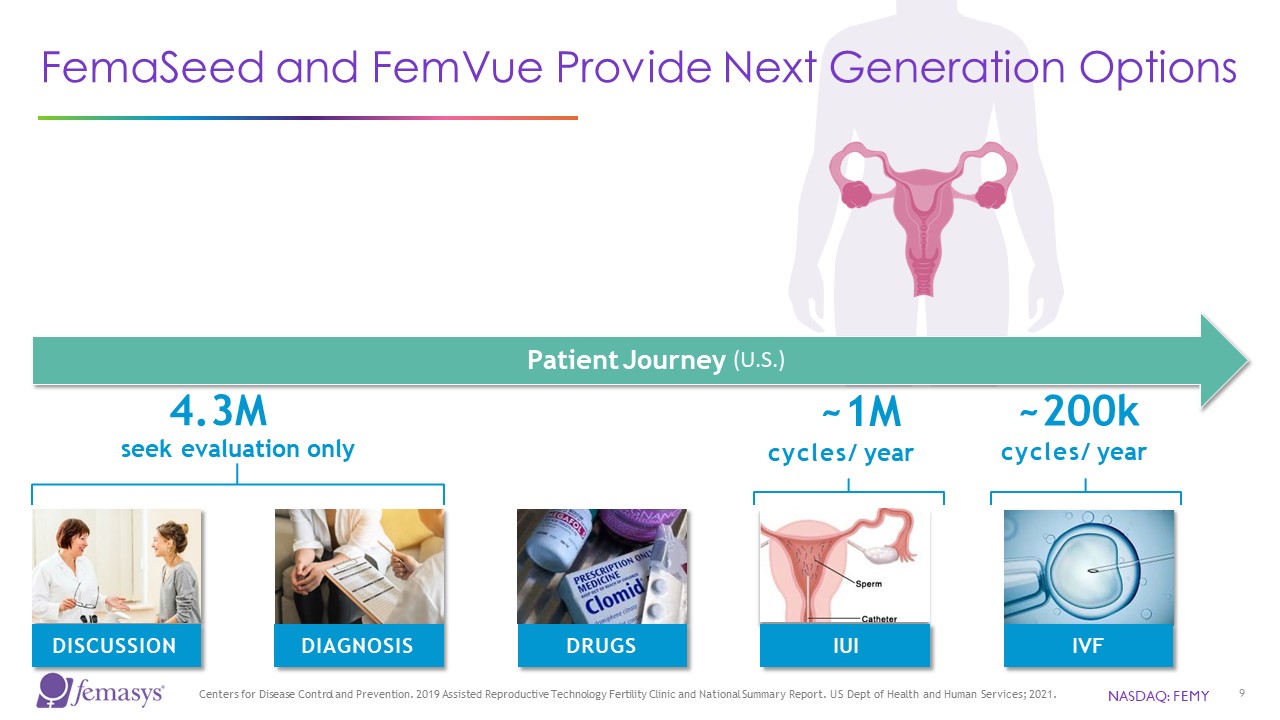 NASDAQ: FEMY  8  No Affordable infertility Options Introduced in Decades  Key Trends:  43 U.S. states have recorded lowest fertility rate in last three decades4  9.14 million women have received infertility services at some time in their lives5  NOTES:  1.  2.  3.  4.  https://www.cdc.gov/nchs/nsfg/key_statistics/i-keystat.htm.  Kumar N, et al. (2015) 5.  Levine H. et al. (2023)  Centers for Disease Control and Prevention (2019) Chandra A, et al. (2014)  ~10M women in the U.S. struggle with infertility1  ~50% due to male factor2  Sperm counts worldwide have declined by >50%3