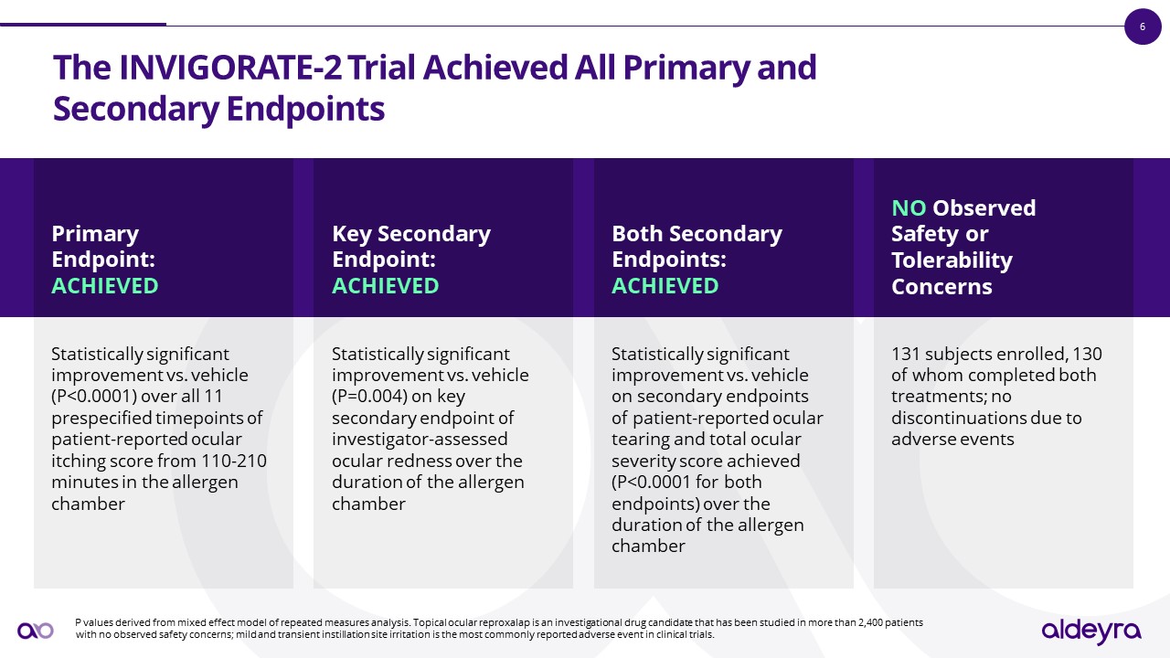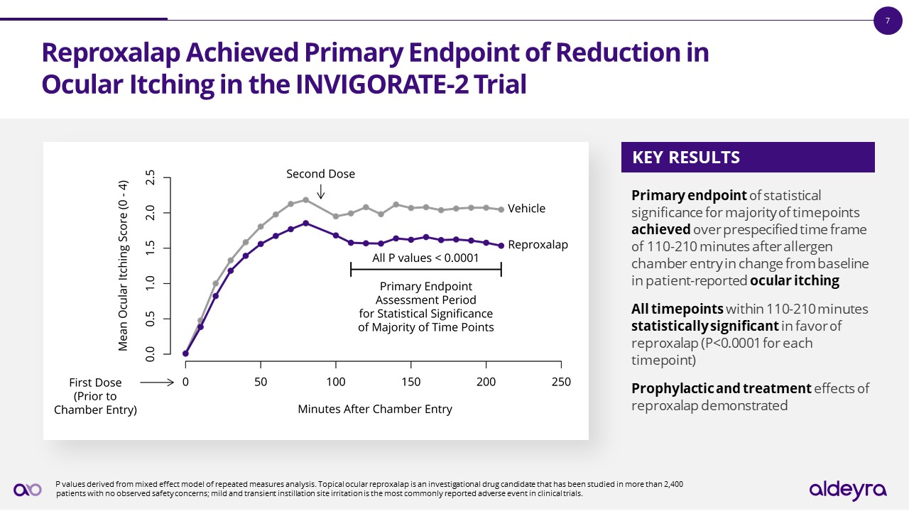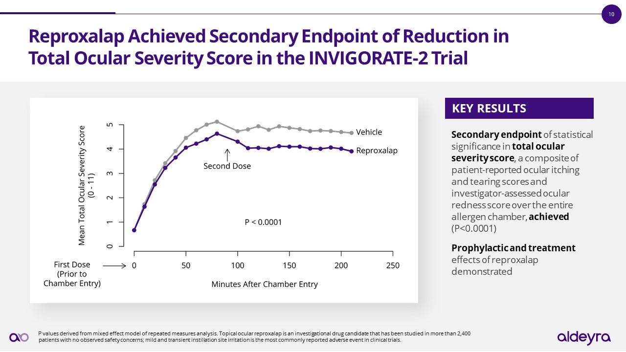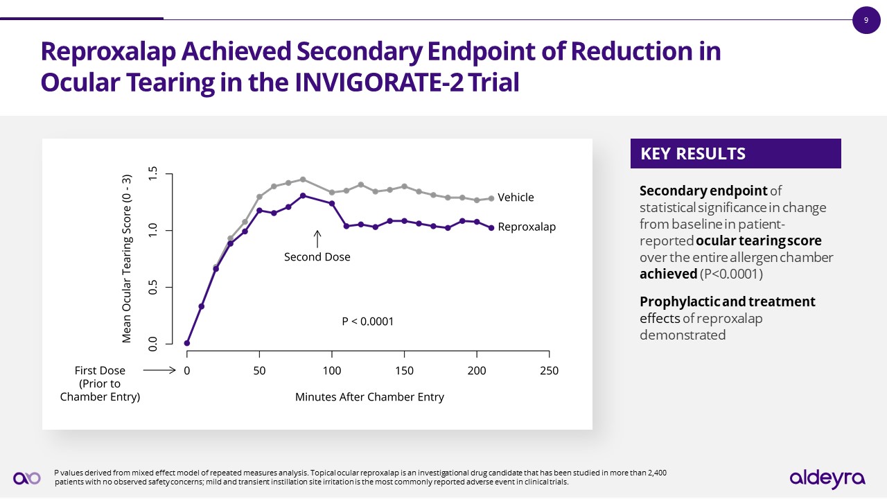 The INVIGORATE-2 Trial Achieved All Primary and Secondary Endpoints     P values derived from mixed effect model of repeated measures analysis. Topical ocular reproxalap is an investigational drug candidate that has been studied in more than 2,400 patients with no observed safety concerns; mild and transient instillation site irritation is the most commonly reported adverse event in clinical trials.  Primary Endpoint:ACHIEVED  Key Secondary Endpoint: ACHIEVED  Both Secondary Endpoints: ACHIEVED  NO Observed Safety or Tolerability Concerns   Statistically significant improvement vs. vehicle (P<0.0001) over all 11 prespecified timepoints of patient-reported ocular itching score from 110-210 minutes in the allergen chamber  Statistically significant improvement vs. vehicle (P=0.004) on key secondary endpoint of investigator-assessed ocular redness over the duration of the allergen chamber  Statistically significant improvement vs. vehicle on secondary endpoints of patient-reported ocular tearing and total ocular severity score achieved (P<0.0001 for both endpoints) over the duration of the allergen chamber  131 subjects enrolled, 130 of whom completed both treatments; no discontinuations due to adverse events
