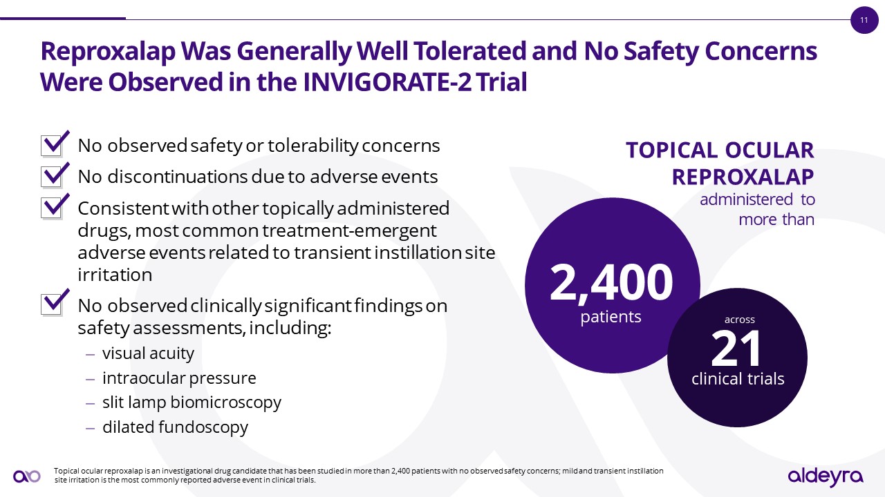 Reproxalap Was Generally Well Tolerated and No Safety Concerns Were Observed in the INVIGORATE-2 Trial  No observed safety or tolerability concerns  No discontinuations due to adverse events  Consistent with other topically administered drugs, most common treatment-emergent adverse events related to transient instillation site irritation  No observed clinically significant findings on safety assessments, including:  visual acuity   intraocular pressure  slit lamp biomicroscopy  dilated fundoscopy  TOPICAL OCULAR REPROXALAP   administered to more than       Topical ocular reproxalap is an investigational drug candidate that has been studied in more than 2,400 patients with no observed safety concerns; mild and transient instillation site irritation is the most commonly reported adverse event in clinical trials.  2,400 patients   21 clinical trials  across