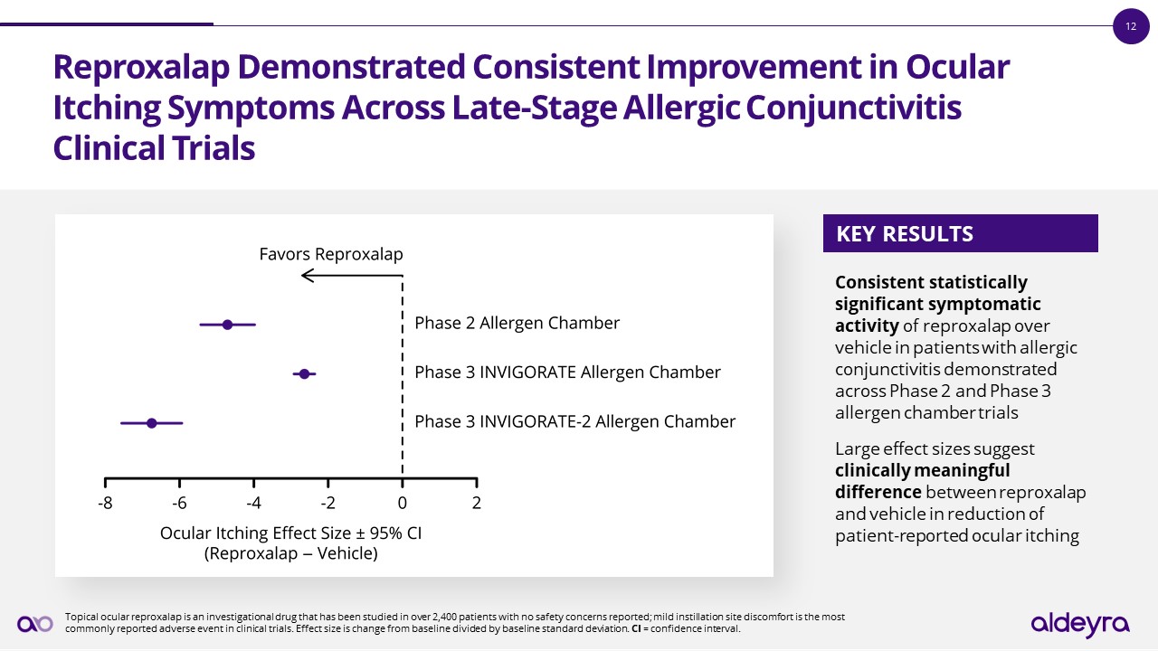 Reproxalap Demonstrated Consistent Improvement in Ocular Itching Symptoms Across Late-Stage Allergic Conjunctivitis Clinical Trials  Consistent statistically significant symptomatic activity of reproxalap over vehicle in patients with allergic conjunctivitis demonstrated across Phase 2 and Phase 3 allergen chamber trials  Large effect sizes suggest clinically meaningful difference between reproxalap and vehicle in reduction of patient-reported ocular itching  KEY RESULTS  Topical ocular reproxalap is an investigational drug that has been studied in over 2,400 patients with no safety concerns reported; mild instillation site discomfort is the most commonly reported adverse event in clinical trials. Effect size is change from baseline divided by baseline standard deviation. CI = confidence interval.