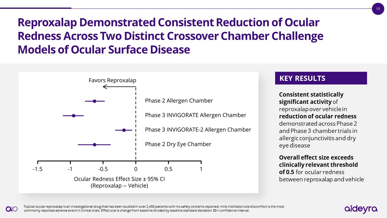Reproxalap Demonstrated Consistent Reduction of Ocular Redness Across Two Distinct Crossover Chamber Challenge Models of Ocular Surface Disease  Consistent statistically significant activity of reproxalap over vehicle in reduction of ocular redness demonstrated across Phase 2 and Phase 3 chamber trials in allergic conjunctivitis and dry eye disease  Overall effect size exceeds clinically relevant threshold of 0.5 for ocular redness between reproxalap and vehicle  KEY RESULTS   Topical ocular reproxalap is an investigational drug that has been studied in over 2,400 patients with no safety concerns reported; mild instillation site discomfort is the most commonly reported adverse event in clinical trials. Effect size is change from baseline divided by baseline standard deviation. CI = confidence interval.