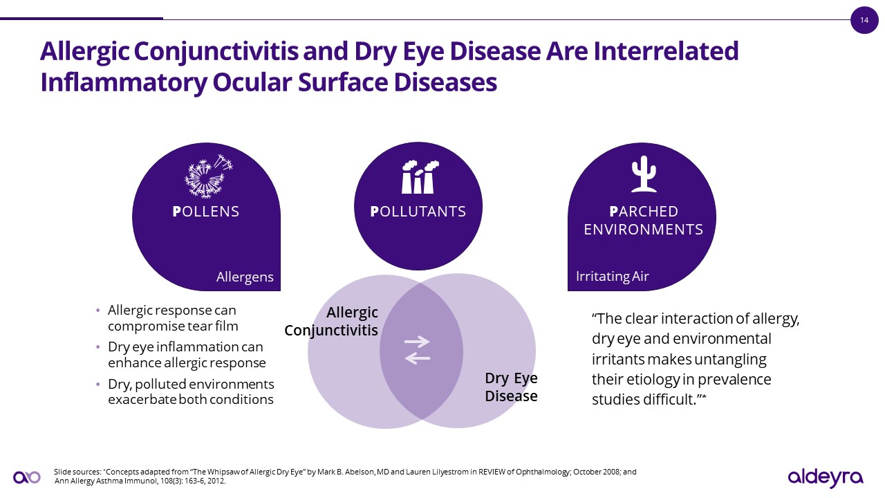 Allergic Conjunctivitis and Dry Eye Disease Are Interrelated Inflammatory Ocular Surface Diseases  Slide sources: *Concepts adapted from “The Whipsaw of Allergic Dry Eye” by Mark B. Abelson, MD and Lauren Lilyestrom in REVIEW of Ophthalmology; October 2008; and Ann Allergy Asthma Immunol, 108(3): 163-6, 2012.  POLLUTANTS  “The clear interaction of allergy, dry eye and environmental irritants makes untangling their etiology in prevalence studies difficult.”*  Dry Eye Disease  Allergic Conjunctivitis  Allergic response can compromise tear film  Dry eye inflammation can enhance allergic response  Dry, polluted environments exacerbate both conditions  POLLENS  Allergens  Irritating Air  PARCHED ENVIRONMENTS