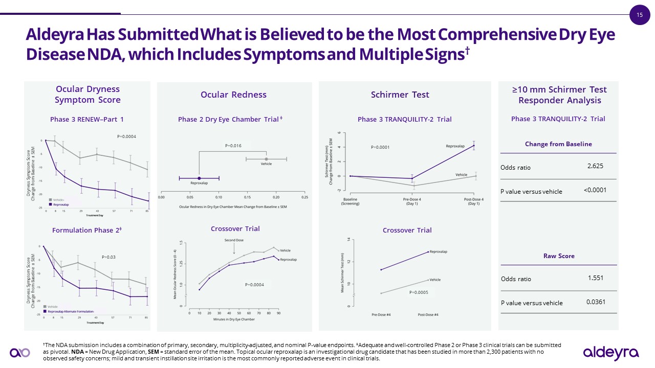 Aldeyra Has Submitted What is Believed to be the Most Comprehensive Dry Eye Disease NDA, which Includes Symptoms and Multiple Signs†  †The NDA submission includes a combination of primary, secondary, multiplicity-adjusted, and nominal P-value endpoints. ‡Adequate and well-controlled Phase 2 or Phase 3 clinical trials can be submitted as pivotal. NDA = New Drug Application, SEM = standard error of the mean. Topical ocular reproxalap is an investigational drug candidate that has been studied in more than 2,300 patients with no observed safety concerns; mild and transient instillation site irritation is the most commonly reported adverse event in clinical trials.   Phase 2 Dry Eye Chamber Trial ‡  Phase 3 RENEW–Part 1  Formulation Phase 2‡  P=0.03  Schirmer Test  Phase 3 TRANQUILITY-2 Trial  Ocular Redness   Ocular Dryness  Symptom Score  ≥10 mm Schirmer Test Responder Analysis  P=0.0001  Phase 3 TRANQUILITY-2 Trial  P=0.0004  Dryness Symptom Score Change from Baseline ± SEM   Dryness Symptom Score Change from Baseline ± SEM   Crossover Trial  Crossover Trial  Change from Baseline  Change from Baseline  Odds ratio  2.625  P value versus vehicle  <0.0001  Raw Score  Change from Baseline  Odds ratio  1.551  P value versus vehicle  0.0361  P=0.016  P=0.0005  P=0.0004
