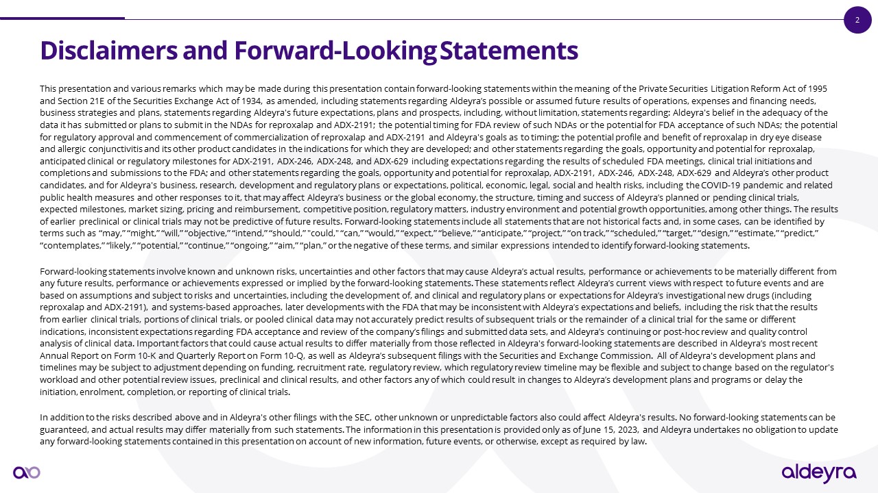 Disclaimers and Forward-Looking Statements  This presentation and various remarks which may be made during this presentation contain forward-looking statements within the meaning of the Private Securities Litigation Reform Act of 1995 and Section 21E of the Securities Exchange Act of 1934, as amended, including statements regarding Aldeyra’s possible or assumed future results of operations, expenses and financing needs, business strategies and plans, statements regarding Aldeyra's future expectations, plans and prospects, including, without limitation, statements regarding: Aldeyra's belief in the adequacy of the data it has submitted or plans to submit in the NDAs for reproxalap and ADX-2191; the potential timing for FDA review of such NDAs or the potential for FDA acceptance of such NDAs; the potential for regulatory approval and commencement of commercialization of reproxalap and ADX-2191 and Aldeyra's goals as to timing; the potential profile and benefit of reproxalap in dry eye disease and allergic conjunctivitis and its other product candidates in the indications for which they are developed; and other statements regarding the goals, opportunity and potential for reproxalap, anticipated clinical or regulatory milestones for ADX-2191, ADX-246, ADX-248, and ADX-629 including expectations regarding the results of scheduled FDA meetings, clinical trial initiations and completions and submissions to the FDA; and other statements regarding the goals, opportunity and potential for reproxalap, ADX-2191, ADX-246, ADX-248, ADX-629 and Aldeyra’s other product candidates, and for Aldeyra's business, research, development and regulatory plans or expectations, political, economic, legal, social and health risks, including the COVID-19 pandemic and related public health measures and other responses to it, that may affect Aldeyra’s business or the global economy, the structure, timing and success of Aldeyra’s planned or pending clinical trials, expected milestones, market sizing, pricing and reimbursement, competitive position, regulatory matters, industry environment and potential growth opportunities, among other things. The results of earlier preclinical or clinical trials may not be predictive of future results. Forward-looking statements include all statements that are not historical facts and, in some cases, can be identified by terms such as “may,” “might,” “will,” “objective,” “intend,” “should,” "could," “can,” “would,” “expect,” “believe,” “anticipate,” “project,” “on track,” “scheduled,” “target,” “design,” “estimate,” “predict,” “contemplates,” “likely,” “potential,” “continue,” “ongoing,” “aim,” “plan,” or the negative of these terms, and similar expressions intended to identify forward-looking statements. ​  Forward-looking statements involve known and unknown risks, uncertainties and other factors that may cause Aldeyra’s actual results, performance or achievements to be materially different from any future results, performance or achievements expressed or implied by the forward-looking statements. These statements reflect Aldeyra’s current views with respect to future events and are based on assumptions and subject to risks and uncertainties, including the development of, and clinical and regulatory plans or expectations for Aldeyra’s investigational new drugs (including reproxalap and ADX-2191), and systems-based approaches, later developments with the FDA that may be inconsistent with Aldeyra’s expectations and beliefs, including the risk that the results from earlier clinical trials, portions of clinical trials, or pooled clinical data may not accurately predict results of subsequent trials or the remainder of a clinical trial for the same or different indications, inconsistent expectations regarding FDA acceptance and review of the company’s filings and submitted data sets, and Aldeyra’s continuing or post-hoc review and quality control analysis of clinical data. Important factors that could cause actual results to differ materially from those reflected in Aldeyra's forward-looking statements are described in Aldeyra’s most recent Annual Report on Form 10-K and Quarterly Report on Form 10-Q, as well as Aldeyra’s subsequent filings with the Securities and Exchange Commission. All of Aldeyra's development plans and timelines may be subject to adjustment depending on funding, recruitment rate, regulatory review, which regulatory review timeline may be flexible and subject to change based on the regulator's workload and other potential review issues, preclinical and clinical results, and other factors any of which could result in changes to Aldeyra’s development plans and programs or delay the initiation, enrolment, completion, or reporting of clinical trials.​  In addition to the risks described above and in Aldeyra's other filings with the SEC, other unknown or unpredictable factors also could affect Aldeyra's results. No forward-looking statements can be guaranteed, and actual results may differ materially from such statements. The information in this presentation is provided only as of June 15, 2023, and Aldeyra undertakes no obligation to update any forward-looking statements contained in this presentation on account of new information, future events, or otherwise, except as required by law.