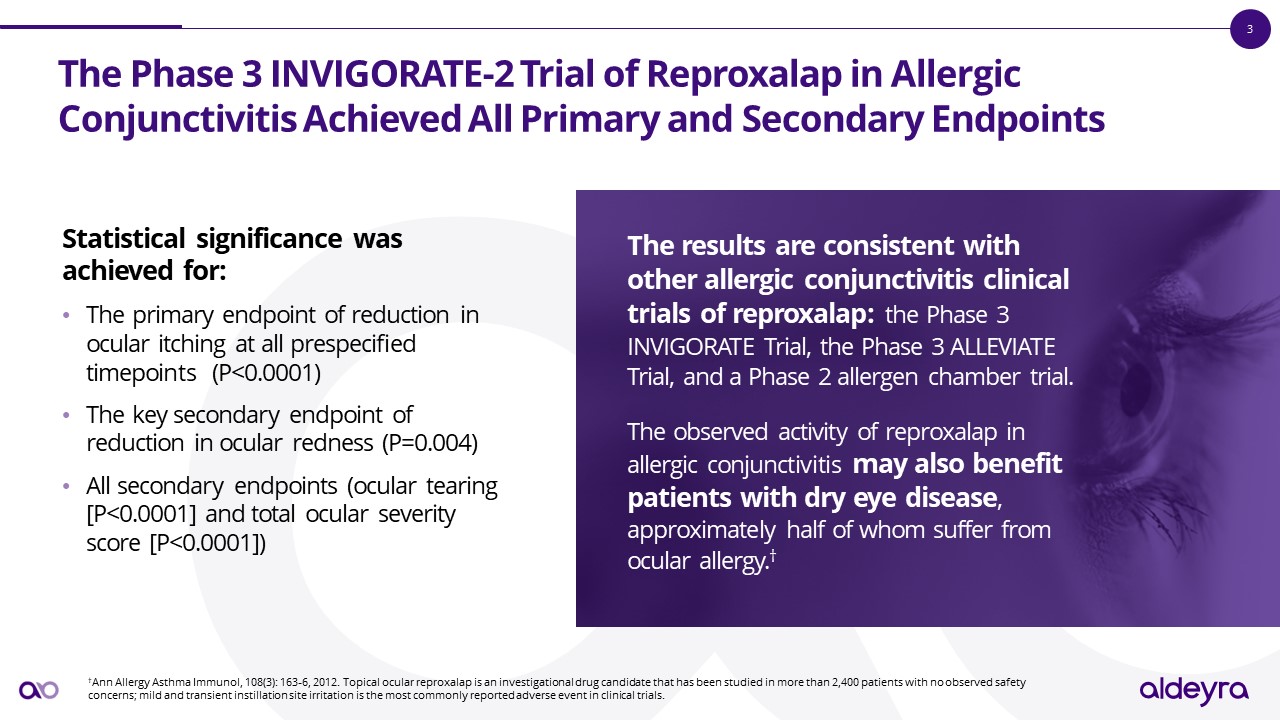 The Phase 3 INVIGORATE-2 Trial of Reproxalap in Allergic Conjunctivitis Achieved All Primary and Secondary Endpoints  Statistical significance was achieved for:   The primary endpoint of reduction in ocular itching at all prespecified timepoints (P<0.0001)   The key secondary endpoint of reduction in ocular redness (P=0.004)  All secondary endpoints (ocular tearing [P<0.0001] and total ocular severity score [P<0.0001])  †Ann Allergy Asthma Immunol, 108(3): 163-6, 2012. Topical ocular reproxalap is an investigational drug candidate that has been studied in more than 2,400 patients with no observed safety concerns; mild and transient instillation site irritation is the most commonly reported adverse event in clinical trials.   The results are consistent with other allergic conjunctivitis clinical trials of reproxalap: the Phase 3 INVIGORATE Trial, the Phase 3 ALLEVIATE Trial, and a Phase 2 allergen chamber trial.  The observed activity of reproxalap in allergic conjunctivitis may also benefit patients with dry eye disease, approximately half of whom suffer from ocular allergy.†