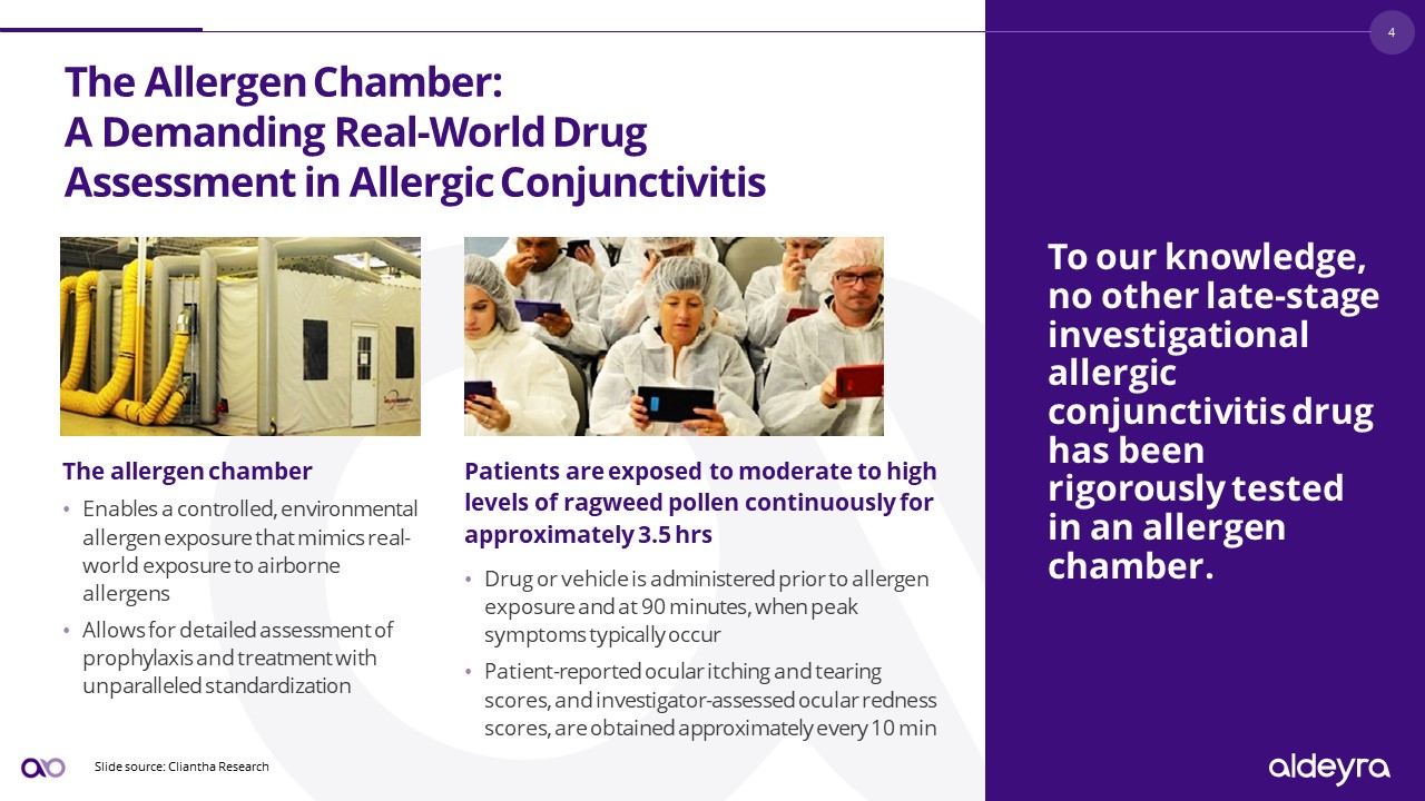 The Allergen Chamber:A Demanding Real-World Drug Assessment in Allergic Conjunctivitis  Slide source: Cliantha Research  The allergen chamber   Enables a controlled, environmental allergen exposure that mimics real-world exposure to airborne allergens  Allows for detailed assessment of prophylaxis and treatment with unparalleled standardization  To our knowledge, no other late-stage investigational allergic conjunctivitis drug has been rigorously tested in an allergen chamber.  Patients are exposed to moderate to high levels of ragweed pollen continuously for approximately 3.5 hrs  Drug or vehicle is administered prior to allergen exposure and at 90 minutes, when peak symptoms typically occur  Patient-reported ocular itching and tearing scores, and investigator-assessed ocular redness scores, are obtained approximately every 10 min  4