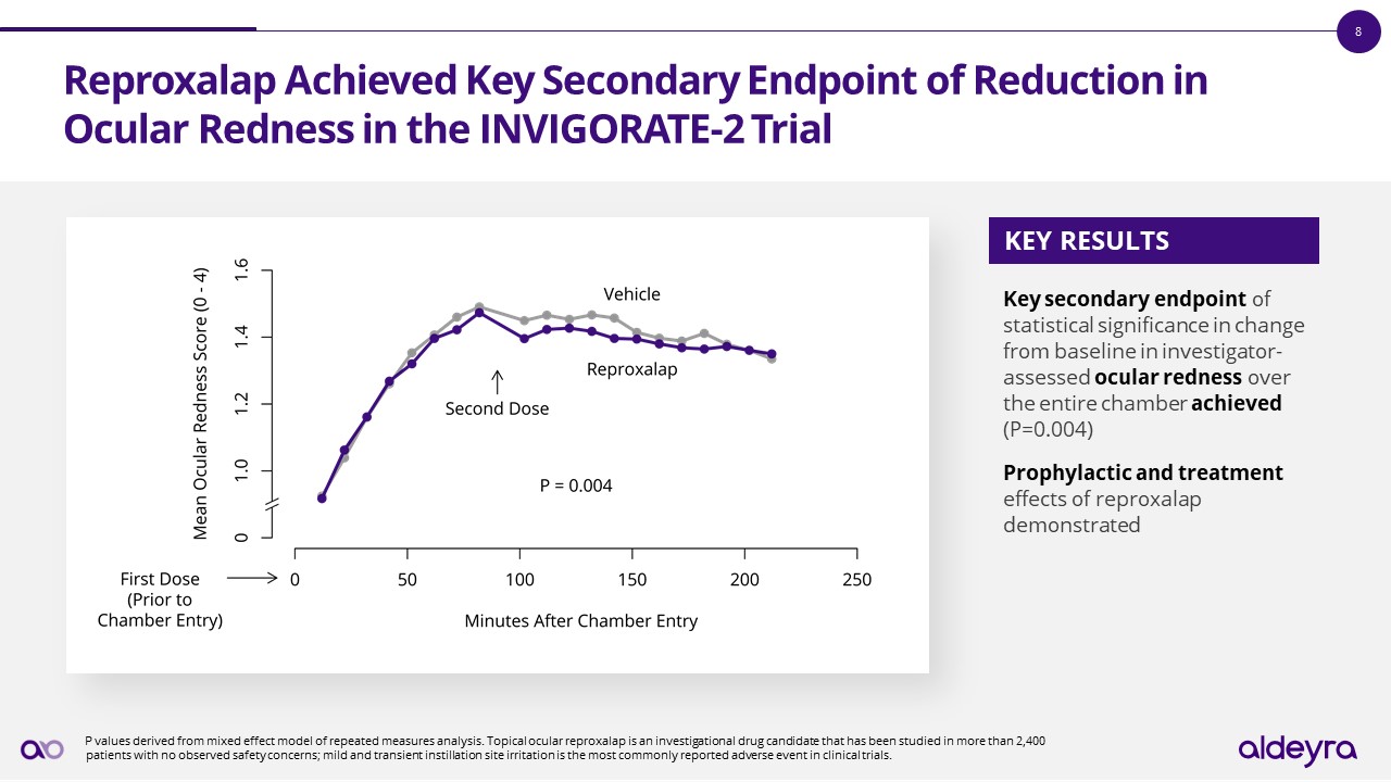 Reproxalap Achieved Key Secondary Endpoint of Reduction in Ocular Redness in the INVIGORATE-2 Trial  Key secondary endpoint of statistical significance in change from baseline in investigator-assessed ocular redness over the entire chamber achieved (P=0.004)   Prophylactic and treatment effects of reproxalap demonstrated  KEY RESULTS    P values derived from mixed effect model of repeated measures analysis. Topical ocular reproxalap is an investigational drug candidate that has been studied in more than 2,400 patients with no observed safety concerns; mild and transient instillation site irritation is the most commonly reported adverse event in clinical trials.