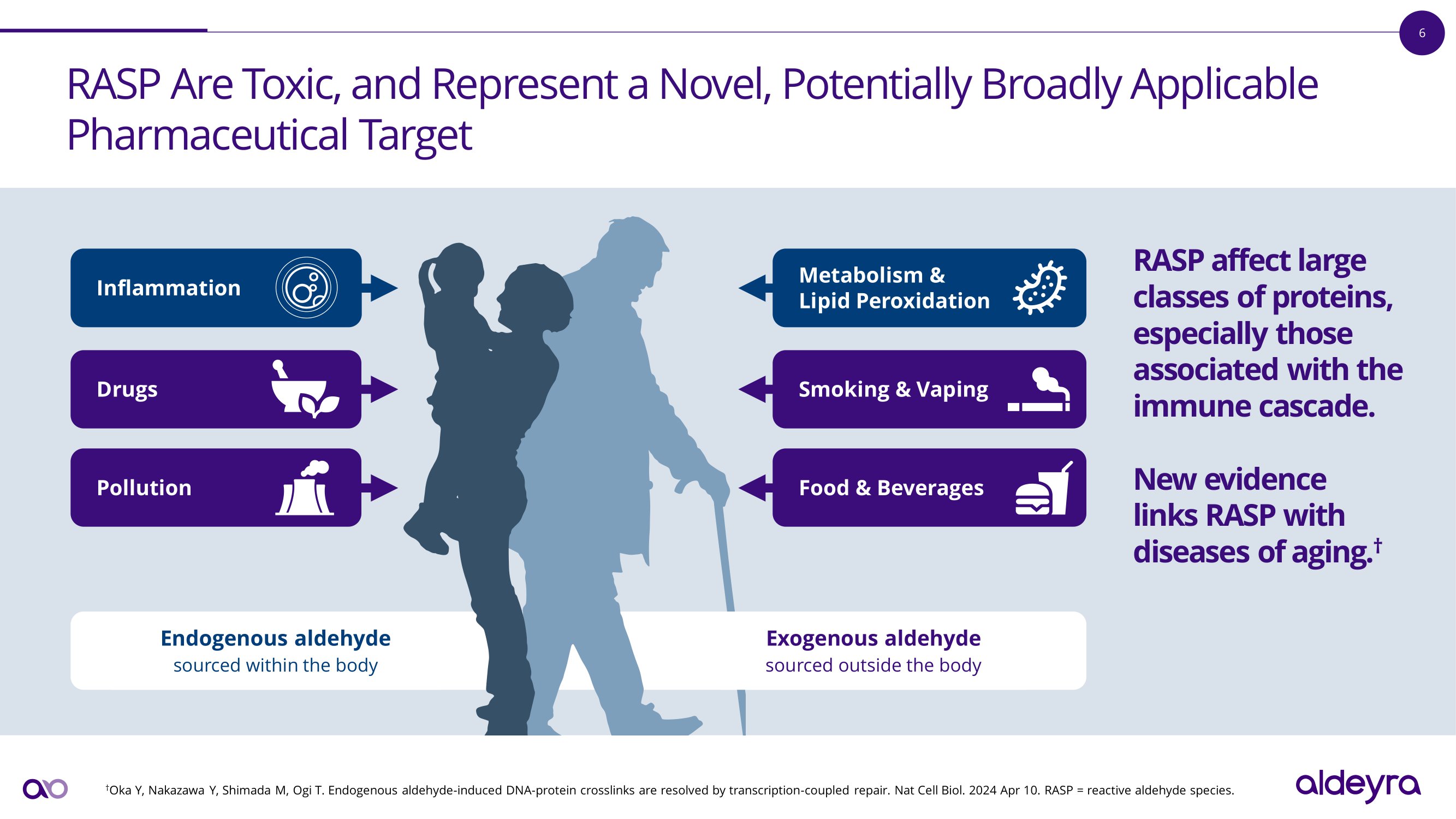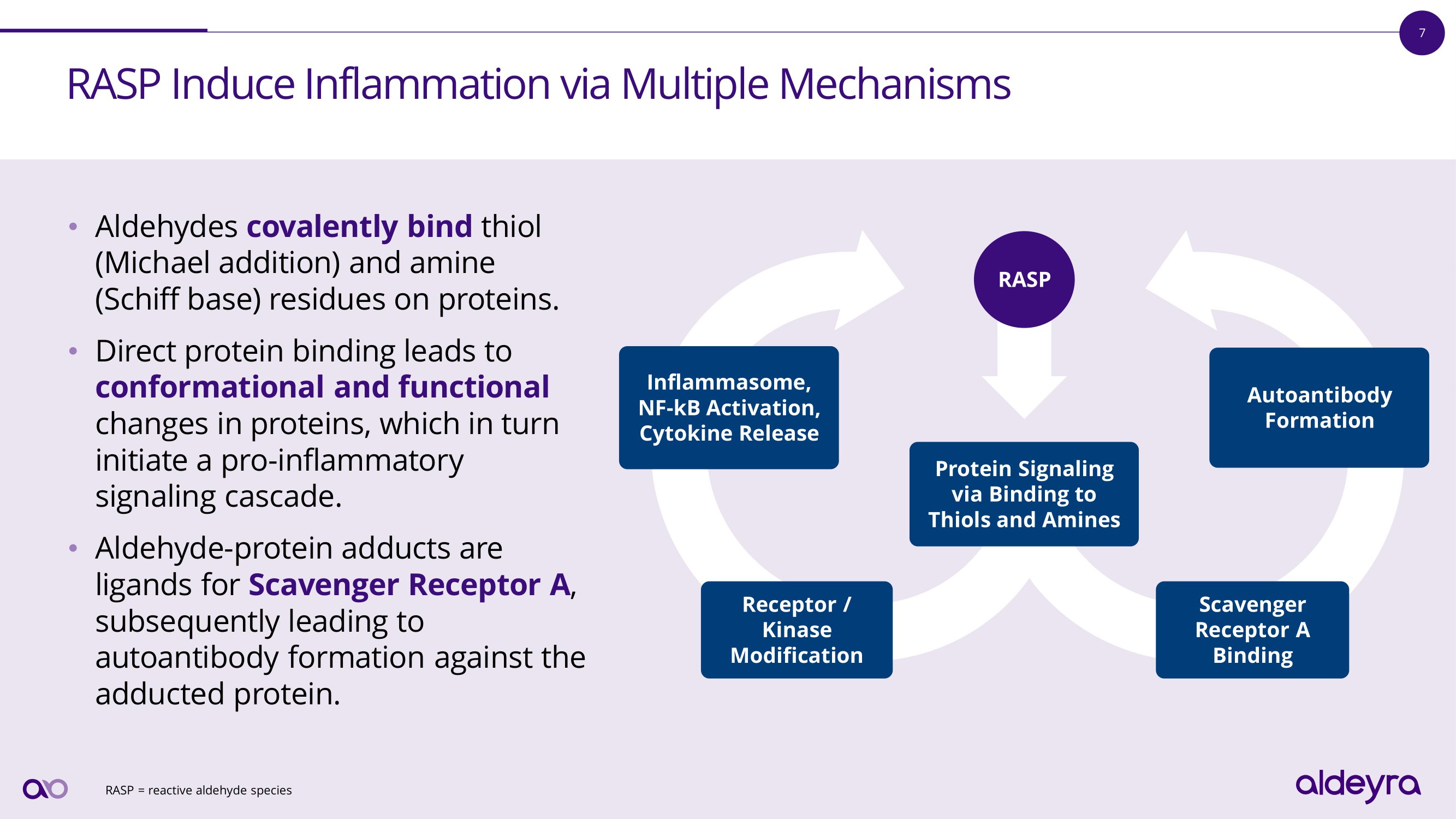 6 RASP Are Toxic, and Represent a Novel, Potentially Broadly Applicable Pharmaceutical Target † Oka Y, Nakazawa Y, Shimada M, Ogi T. Endogenous aldehyde - induced DNA - protein crosslinks are resolved by transcription - coupled repair. Nat Cell Biol. 2024 Apr 10. RASP = reactive aldehyde species. Endogenous aldehyde sourced within the body Exogenous aldehyde sourced outside the body Smoking & Vaping Metabolism & Lipid Peroxidation Pollution D r ugs Inflammation Food & Beverages R A S P a ff e c t l a r g e c l a ss e s o f p r o t e i n s , e s p e c i a l l y t h o s e a ss o c i a t e d w i t h t h e i mm un e c a s c a d e . N e w ev i d e n c e li n k s R A S P w i t h d i s e a s e s o f a g i n g . †
