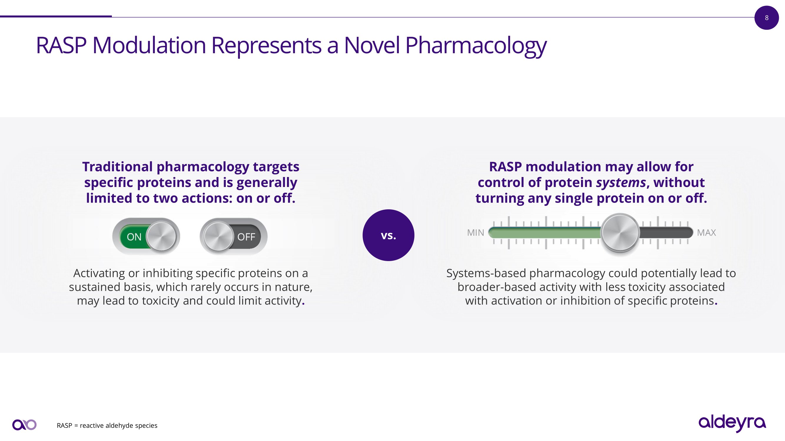 8 R A S P M o du l a t i o n R e p r e s e n t s a N o v e l P h a r m a c o l o g y RASP = reactive aldehyde species Traditional pharmacology targets specific proteins and is generally limited to two actions : on or off . Activating or inhibiting specific proteins on a sustained basis, which rarely occurs in nature, may lead to toxicity and could limit activity . R A SP m o d u l a t i o n m a y a ll o w f o r control of protein systems , without turning any single protein on or off. . Systems - based pharmacology could potentially lead to broader - based activity with less toxicity associated with activation or inhibition of specific proteins . vs.
