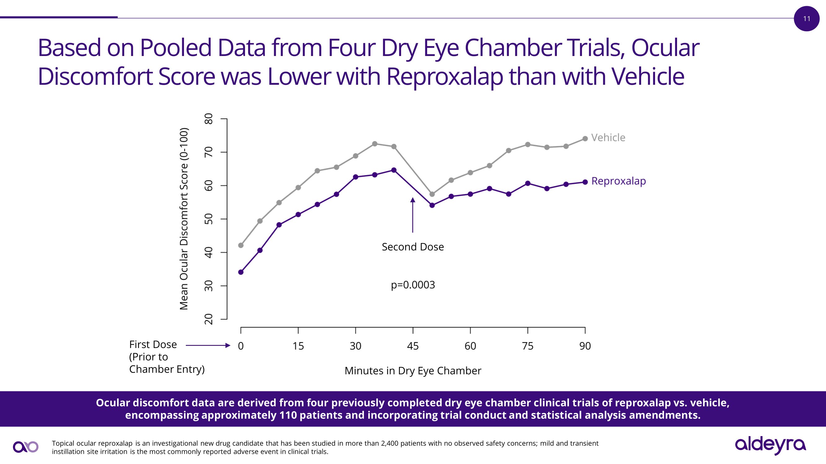 10 Phase 3 Clinical Trial of Reproxalap in a Dry Eye Chamber † ization • Randomized, double - masked, vehicle - controlled dry eye chamber challenge Random Design Visit 4 Vehicle Chamber • Visit 1: Medical screening • Visit 2: Vehicle dry eye chamber (dosing just before and 50 minutes after entry) Visit 2 • Visit 3: Four doses of randomized treatment Treatment Vehicle (reproxalap or vehicle) z Arm A: Chamber • Visit 4: Randomized dry eye chamber (dosing just before and 50 minutes after entry) Dosing Drug Chamber Treatment Vehicle ~100 dry eye disease patients Arm B: Chamber Size Ocular discomfort score Primary Endpoint Safety O t he r E n dp o in t s Pending clinical trial results, feedback from ongoing FDA discussions, and other factors, NDA resubmission expected in H2 2024 †‡ †The timing of clinical trials depends, in part, on the availability of clinical research facilities and staffing, the ability to recruit patients, and the number of patients in the trial. ‡Regulatory review and discussion timelines are flexible and subject to change based on the regulator's workload and other potential review issues.