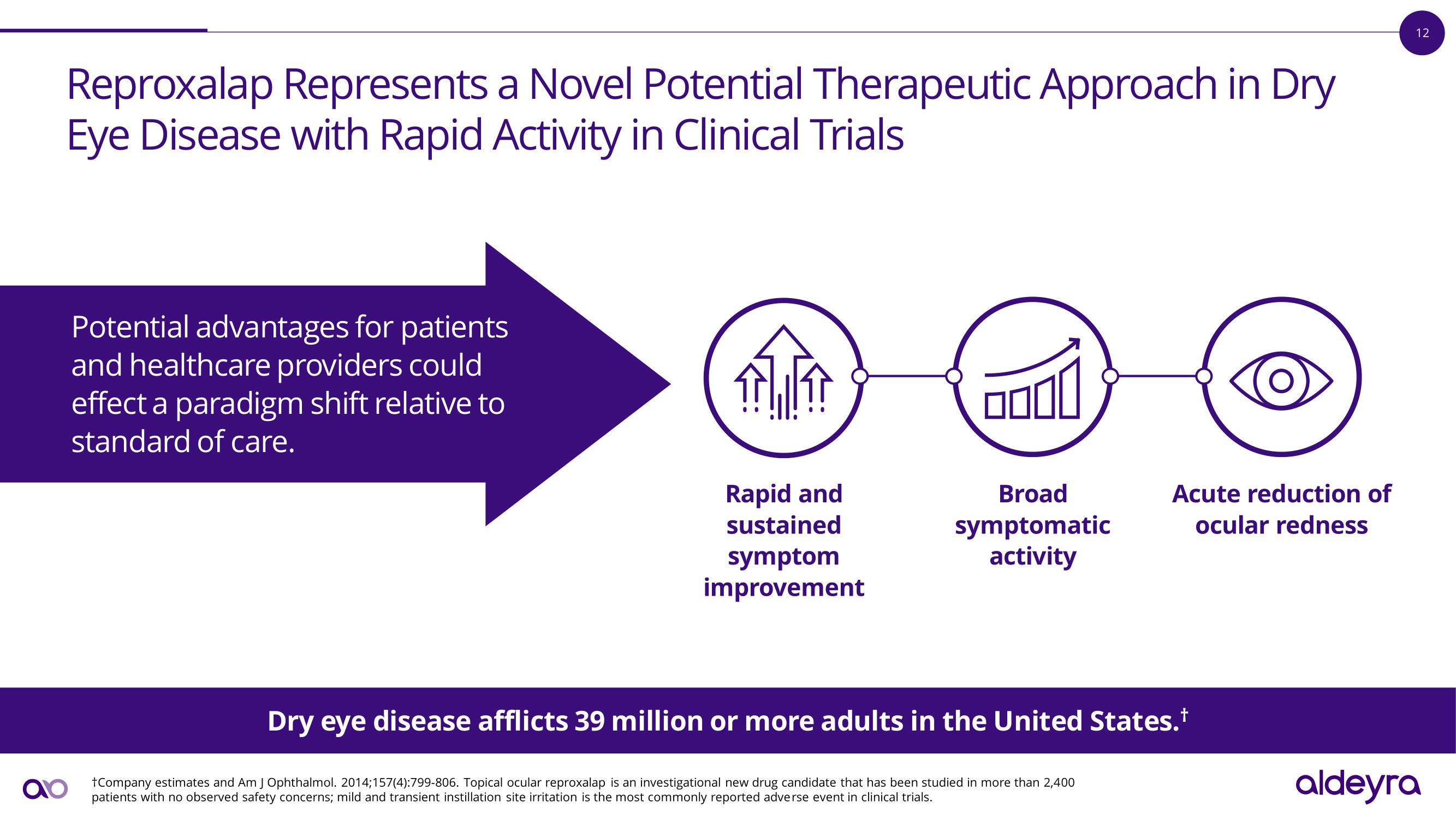 3 D i sc l a i m e r s a n d F o r w a r d - L oo k i n g S t a t e m e n t s This presentation and various remarks which may be made during this presentation contain forward - looking statements within the meaning of the Private Securities Litigation Reform Act of 1995 and Section 21E of the Securities Exchange Act of 1934, as amended, including statements regardingAldeyra's future expectations, plans and prospects, including, without limitation, statements regarding: the goals, opportunity, and potential forreproxalap, ADX - 2191, ADX - 246, ADX - 248, and ADX - 629; anticipated clinical or regulatory milestones for reproxalap, ADX - 2191, ADX - 246, ADX - 248, and ADX - 629; FDA agreement with the clinical development plan for reproxalap; expectations regarding the results of scheduled FDA meetings and discussions, clinical trial initiations and completions, and the timing and nature of NDA or other submissions to the FDA; Aldeyra's business, research, development and regulatory plans or expectations; and the structure, timing and success of Aldeyra’s planned or pending clinical trials. The results of earlier preclinical or clinical trials may not be predictive of future results. Forward - looking statements include all statements that are not historical facts and, in some cases, can be identified by terms such as “may,” “might,” “will,” “objective,” “intend,” “should,” "could," “can,” “would,” “expect,” “believe,” “anticipate,” “project,” “on track,” “scheduled,” “target,” “design,” “estimate,” “predict,” “contemplates,” “likely,” “potential,” “continue,” “ongoing,” “aim,” “plan,” or the negative of these terms, and similar expressions intended to identify forward - looking statements. Forward - looking statements involve known and unknown risks, uncertainties and other factors that may cause Aldeyra’s actual results, performance or achievements to be materially different from any future results, performance or achievements expressed or implied by the forward - looking statements. These statements reflect Aldeyra’s current views with respect to future events and are based on assumptions and subject to risks and uncertainties, including the development of, and clinical and regulatory plans or expectations for Aldeyra’s investigational new drugs (including reproxalap, ADX - 2191, ADX - 246, ADX - 248, and ADX - 629), and systems - based approaches, later developments with the FDA that may be inconsistent with Aldeyra’s expectations and beliefs, including the risk that the results from earlier clinical trials, portions of clinical trials, or pooled clinical data may not accurately predict results of subsequent trials or the remainder of a clinical trial for the same or different indications, inconsistent expectations regarding FDA acceptance and review of the company’s filings and submitted data sets, and Aldeyra’s continuing or post - hoc review and quality control analysis of clinical data. Important factors that could cause actual results to differ materially from those reflected in Aldeyra's forward - looking statements are described in Aldeyra’s most recent Annual Report on Form 10 - K and Quarterly Report on Form 10 - Q, as well as Aldeyra’s subsequent filings with the Securities and Exchange Commission. All of Aldeyra's development plans and timelines may be subject to adjustment depending on funding, recruitment rate, regulatory review, which regulatory review timeline may be flexible and subject to change based on the regulator's workload and other potential review issues, preclinical and clinical results, regulatory developments in the United States and other countries, and other factors any ofwhich could result in changes to Aldeyra’s development plans and programs or delay the initiation, enrolment, completion, or reporting of clinical trials. In addition to the risks described above and in Aldeyra's other filings with the SEC, other unknown or unpredictable factors also could affect Aldeyra's results. No forward - looking statements can be guaranteed, and actual results may differ materially from such statements. The information in this presentation is provided only as of April 25, 2024 , and Aldeyra undertakes no obligation to update any forward - looking statements contained in this presentation on account of new information, future events, or otherwise, except as required by law.