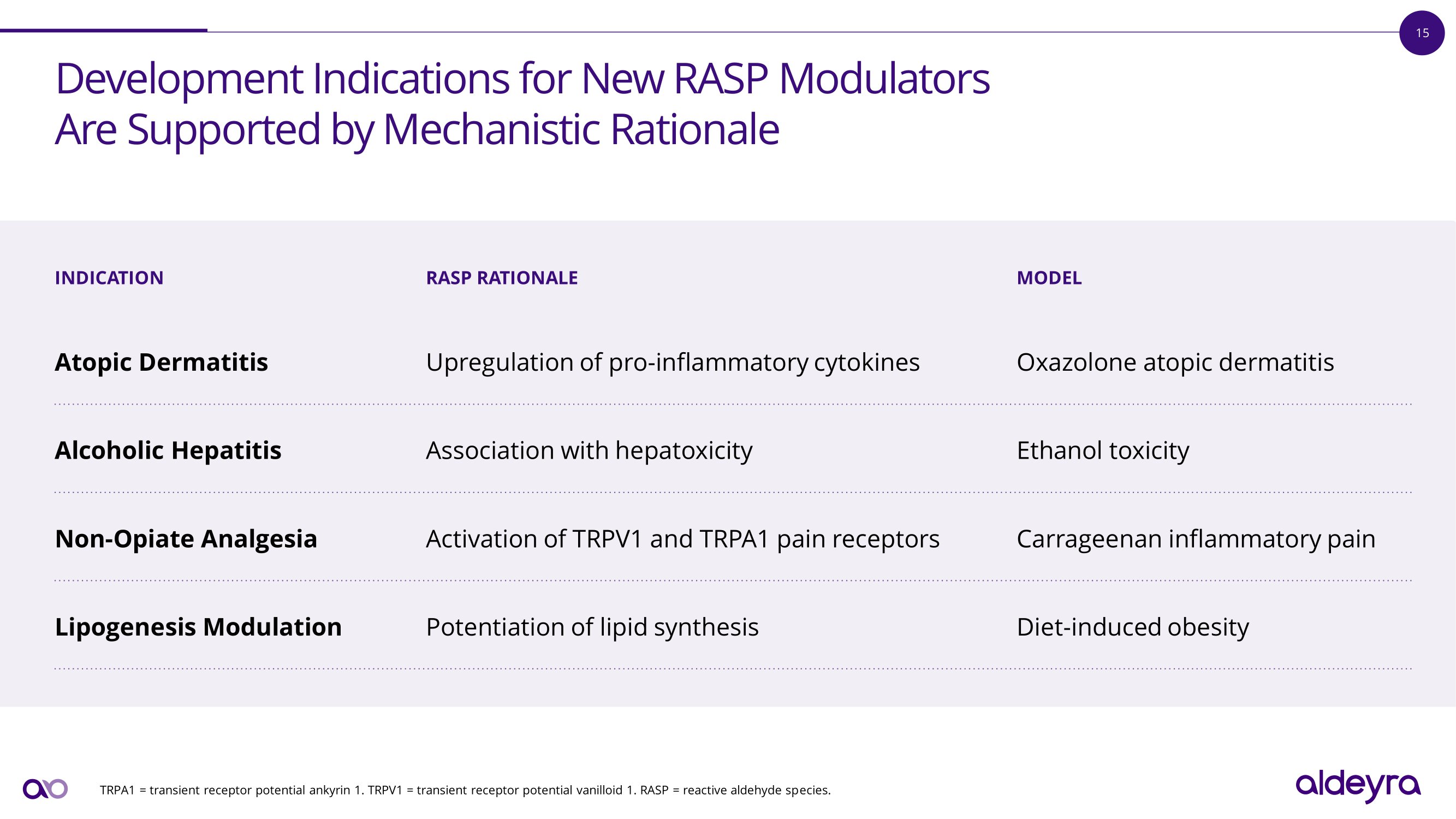 14 Aldeyra Has Developed the Leading RASP Modulator Discovery Platform I n V i t r o R ASP Bi nd i ng Murine Sepsis Cytokine Assay In Vitro Drugability Characterization Exploratory Toxicology Can d i d acy Sy s t e m i c Can d i d a t e s Retinal Can d i d a t e s A l d e y r a ’ s R A S P modulator discovery a n d d ev el o p m e n t p l a t f o r m i s un p ara ll e l e d A D X - 629 , A D X - 246 , a n d A D X - 248 ADX - 629, ADX - 248, and ADX - 246 are investigational drug candidates.