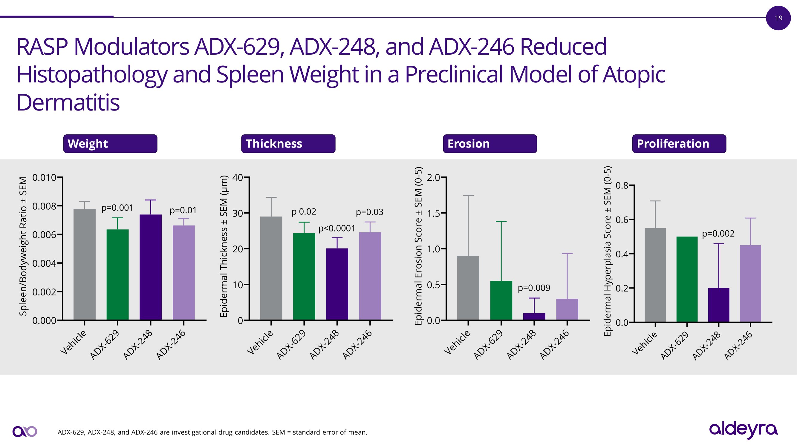 18 Oxazolone Sensitization is a Well - Characterized P r e c li n i c a l M o d e l o f A t o p i c D e r m a t i t i s Treatment Dosing (Oral) Day 8 Hi s to p atho l o g y Day 0 5% Oxazolone Sensitization Day 7 3% Oxazolone Challenge Day 4