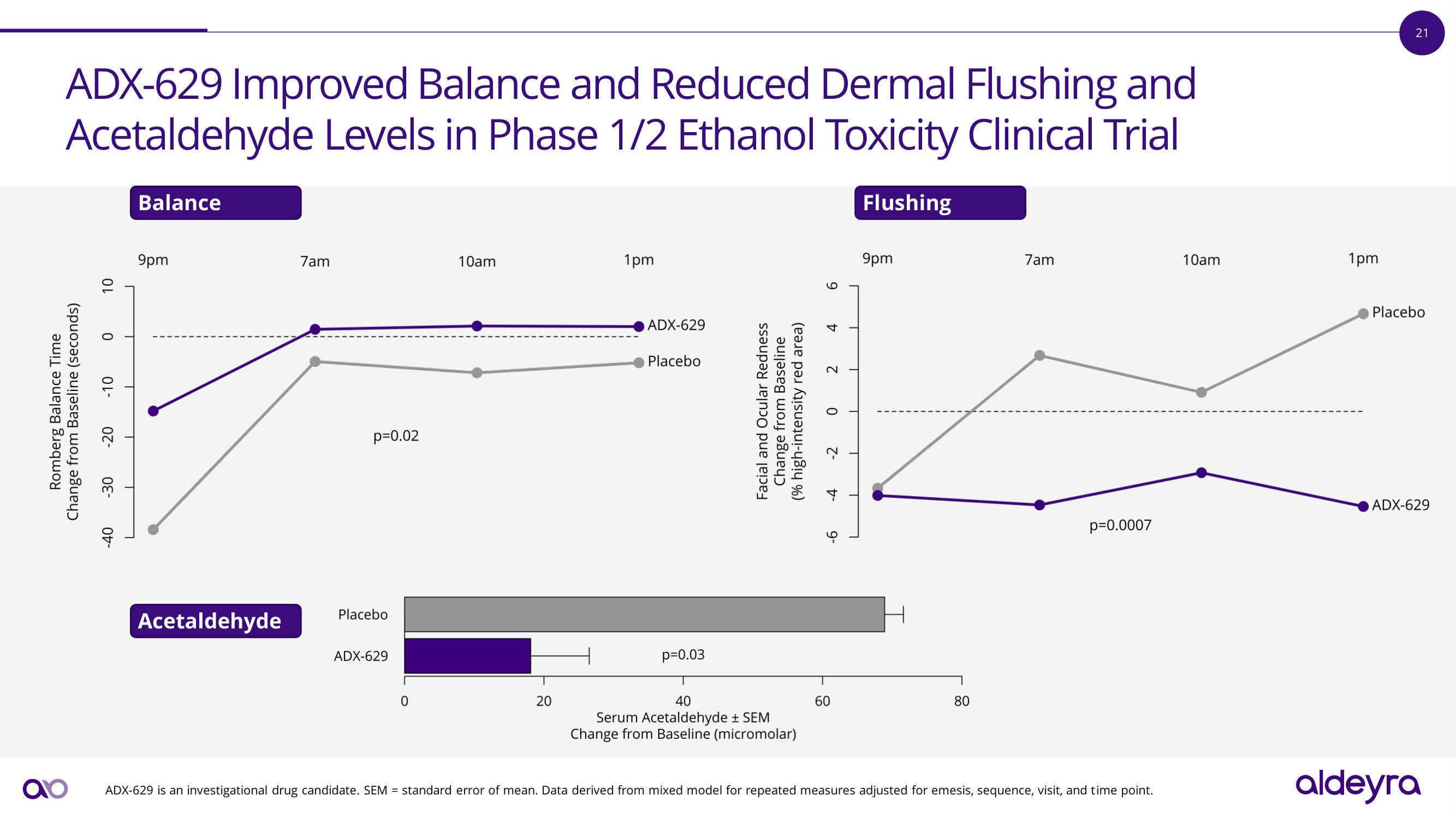 21 A D X - 62 9 I m p r o v e d B a l a n c e a n d R e d u c e d D e r m a l F l u s h i n g a n d Acetaldehyde Levels in Phase 1/2 Ethanol Toxicity Clinical Trial ADX - 629 is an investigational drug candidate. SEM = standard error of mean. Data derived from mixed model for repeated measures adjusted for emesis, sequence, visit, and time point. Balance Flushing Acetaldehyde