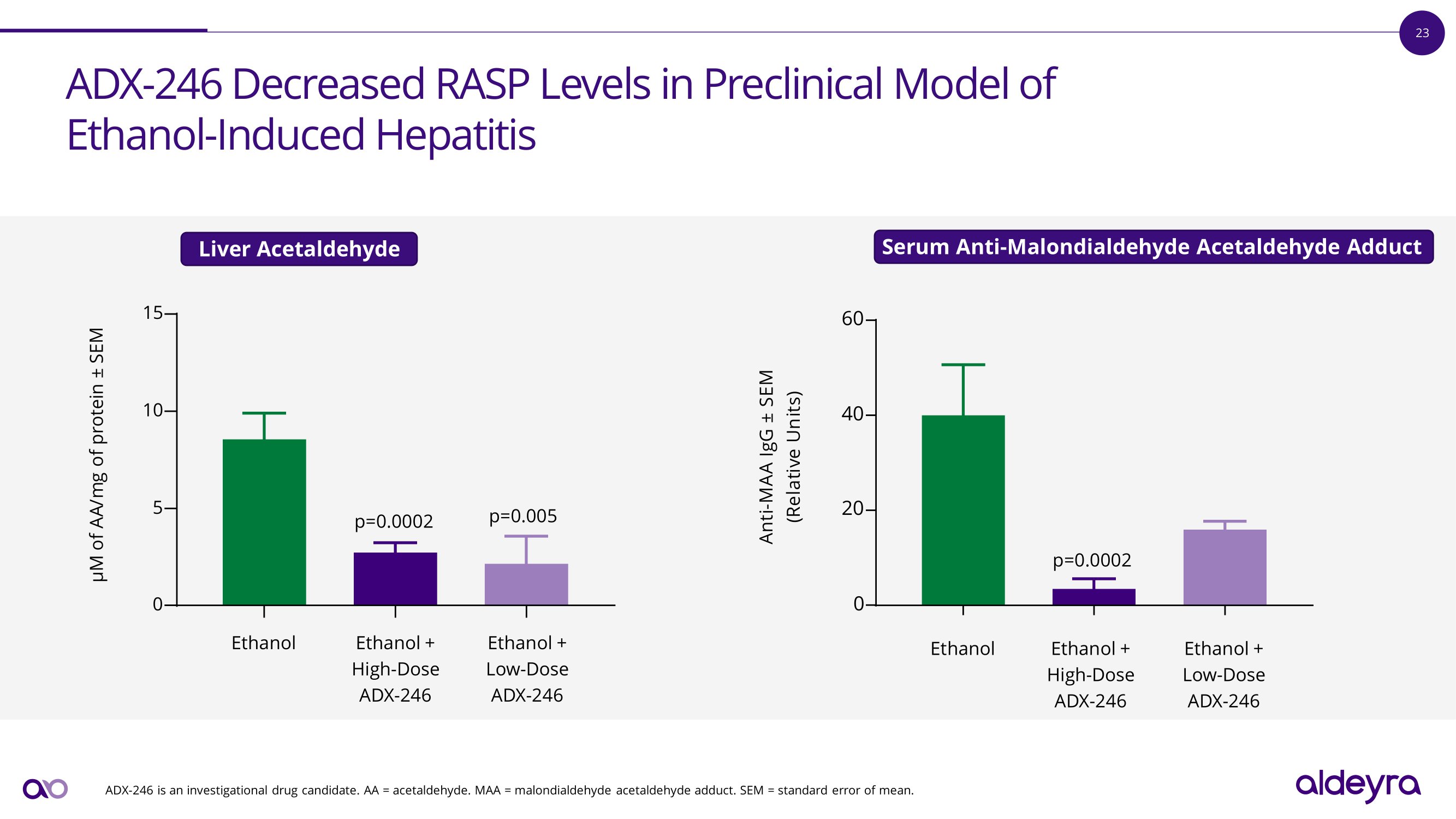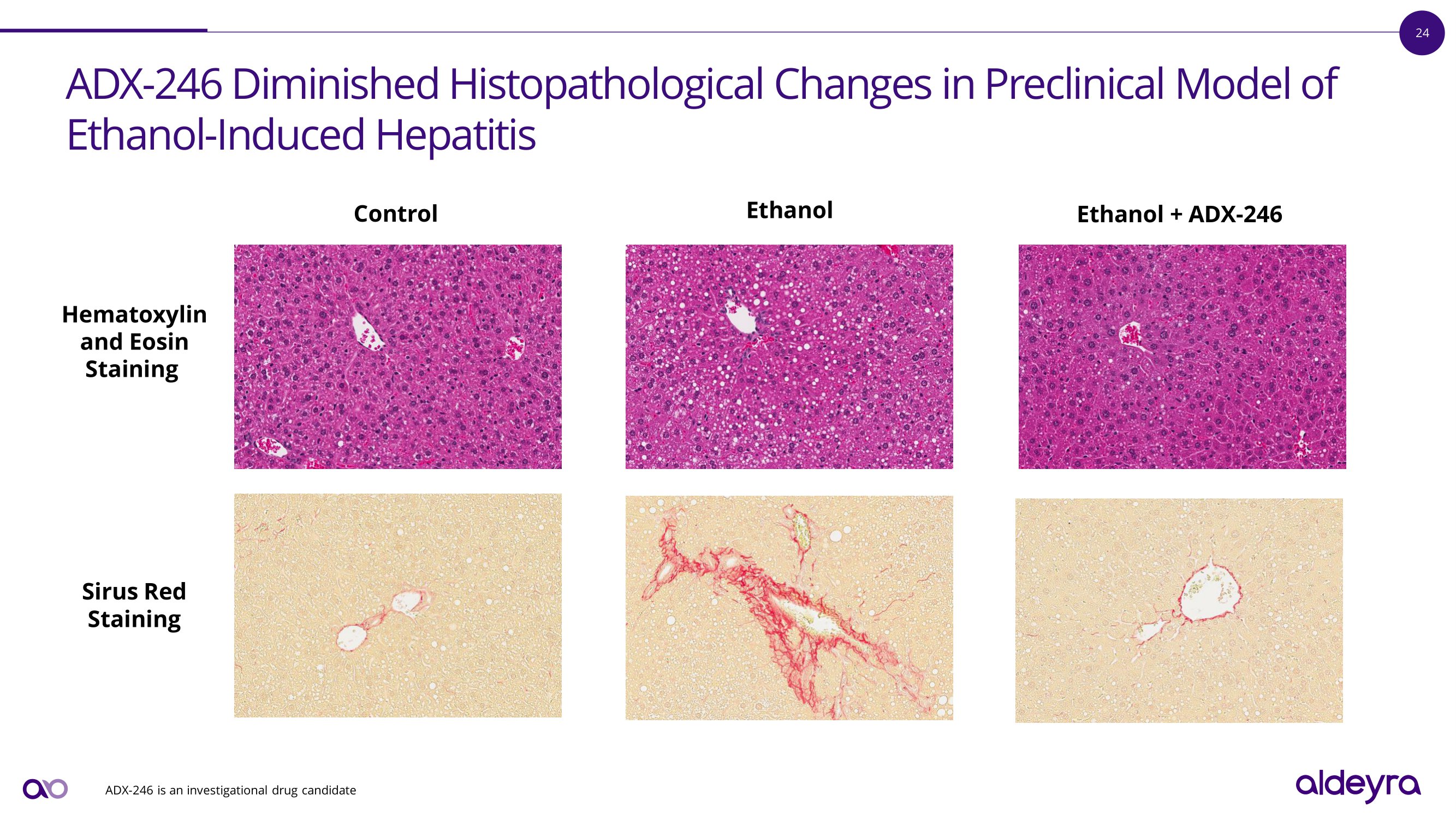 23 ADX - 246 Decreased RASP Levels in Preclinical Model of E t h a n o l - I ndu c e d H e p a t i t i s ADX - 246 is an investigational drug candidate. AA = acetaldehyde. MAA = malondialdehyde acetaldehyde adduct. SEM = standard error of mean. p=0.005 p = 0 . 000 2 0 5 10 15 µM of AA/mg of protein “ SEM E t h a n o l + L o w - D o se ADX - 246 E t h a n o l + H i g h - D os e ADX - 246 E t h a n o l p = 0 . 000 2 0 20 40 60 Anti - MAA IgG “ SEM (Relative Units) E t h a n o l + L o w - D o se ADX - 246 E t h a n o l + H i g h - D o se ADX - 246 E t h a n o l Liver Acetaldehyde Serum Anti - Malondialdehyde Acetaldehyde Adduct