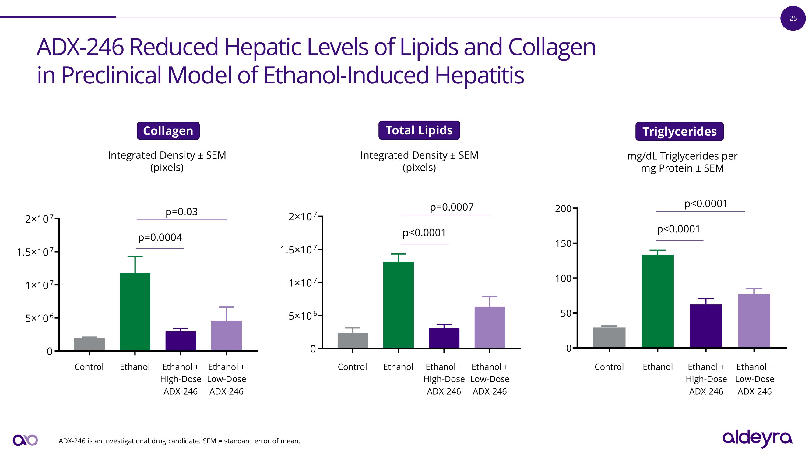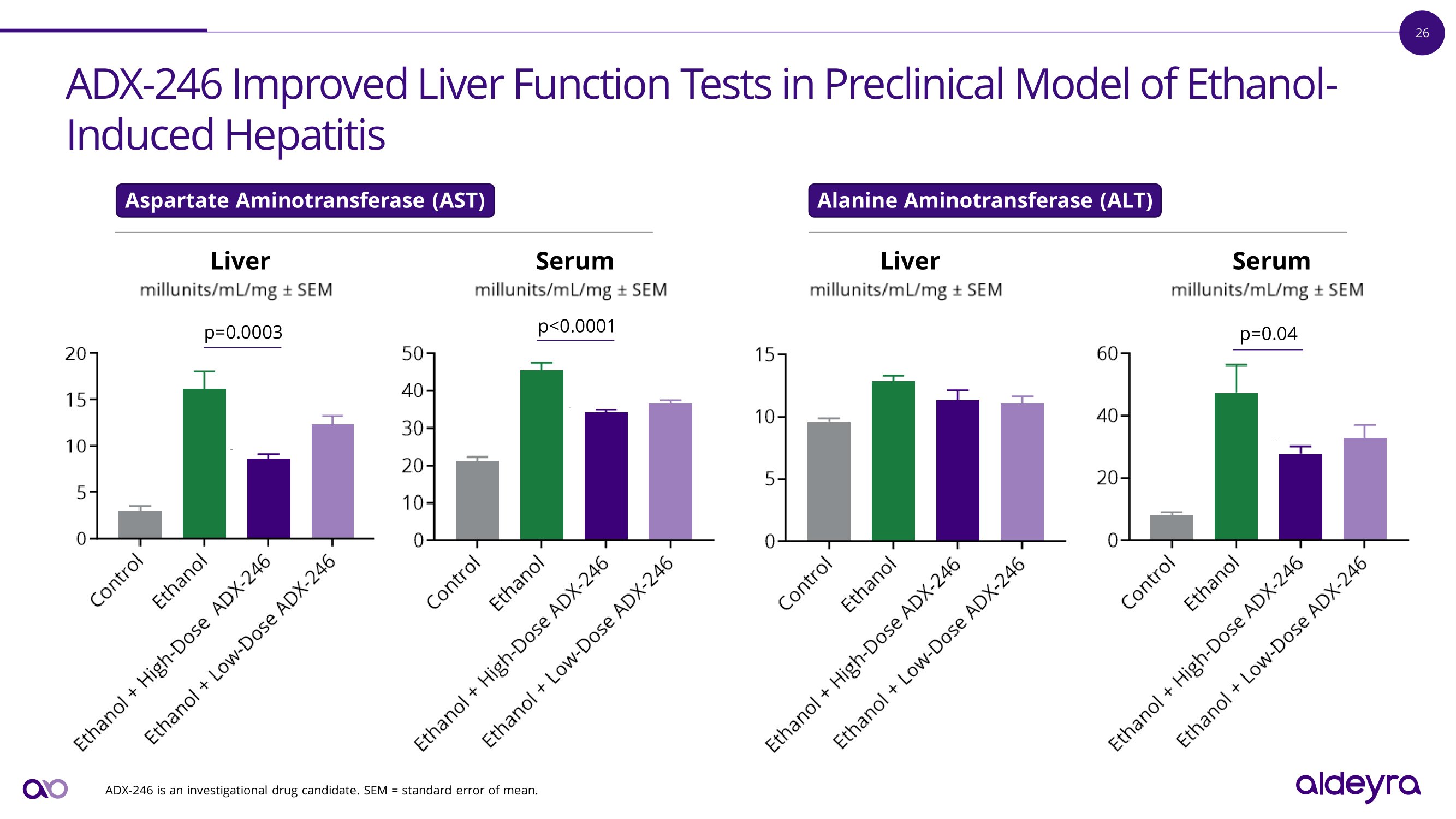 25 0 5 î 10 6 1 î 10 7 1.5 î 10 7 2 î 10 7 p=0.03 p=0.0004 E t h a n o l E t h a n o l + E t h a n o l + High - Dose Low - Dose ADX - 246 ADX - 246 C o n t r o l A D X - 24 6 R e d u c e d H e p a t i c L e v e l s o f L i p i d s a n d C o ll a g e n i n P r e c li n i c a l M o d e l o f E t h a n o l - I n d u c e d H e p a t i t i s 0 5 0 10 0 15 0 20 0 p<0.0001 p<0.0001 E t h a n o l + L o w - D o se ADX - 246 E t h a n o l + H i gh - D o se ADX - 246 Ethanol C o n t r o l 0 5 î 10 6 1 î 10 7 1.5 î 10 7 2 î 1 0 7 p=0.0007 p<0.0001 Ethanol + Ethanol + High - Dose Low - Dose ADX - 246 ADX - 246 E t h a n o l C o n t r o l ADX - 246 is an investigational drug candidate. SEM = standard error of mean. Collagen Integrated Density “ SEM (pixels) Total Lipids Triglycerides Integrated Density “ SEM (pixels) mg/dL Triglycerides per mg Protein “ SEM