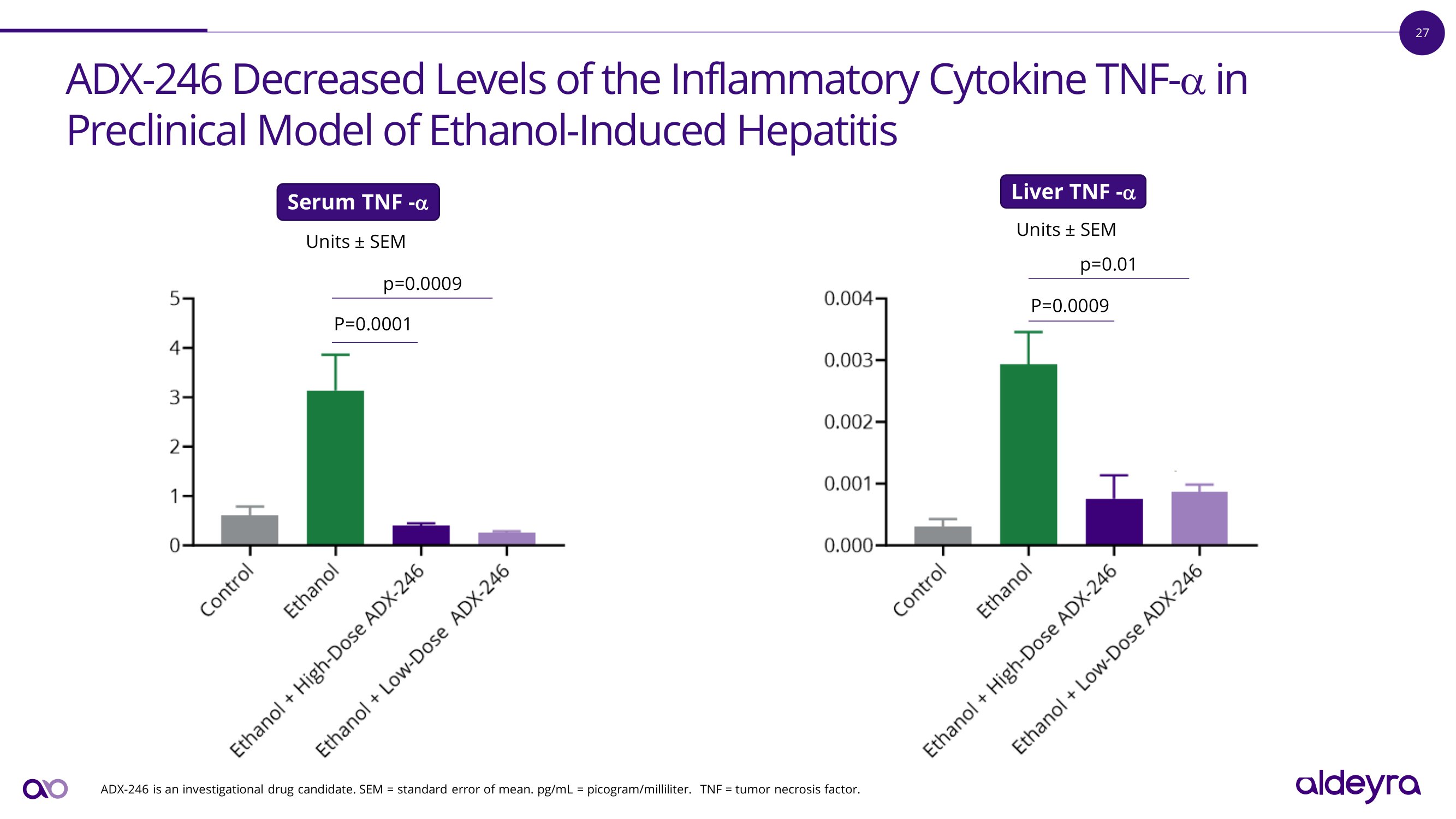 26 ADX - 246 Improved Liver Function Tests in Preclinical Model of Ethanol - Induced Hepatitis ADX - 246 is an investigational drug candidate. SEM = standard error of mean. Aspartate Aminotransferase (AST) Alanine Aminotransferase (ALT) Li v e r S e r u m Li v e r S e r um p = 0 . 000 3 p=0.04 p<0.0001