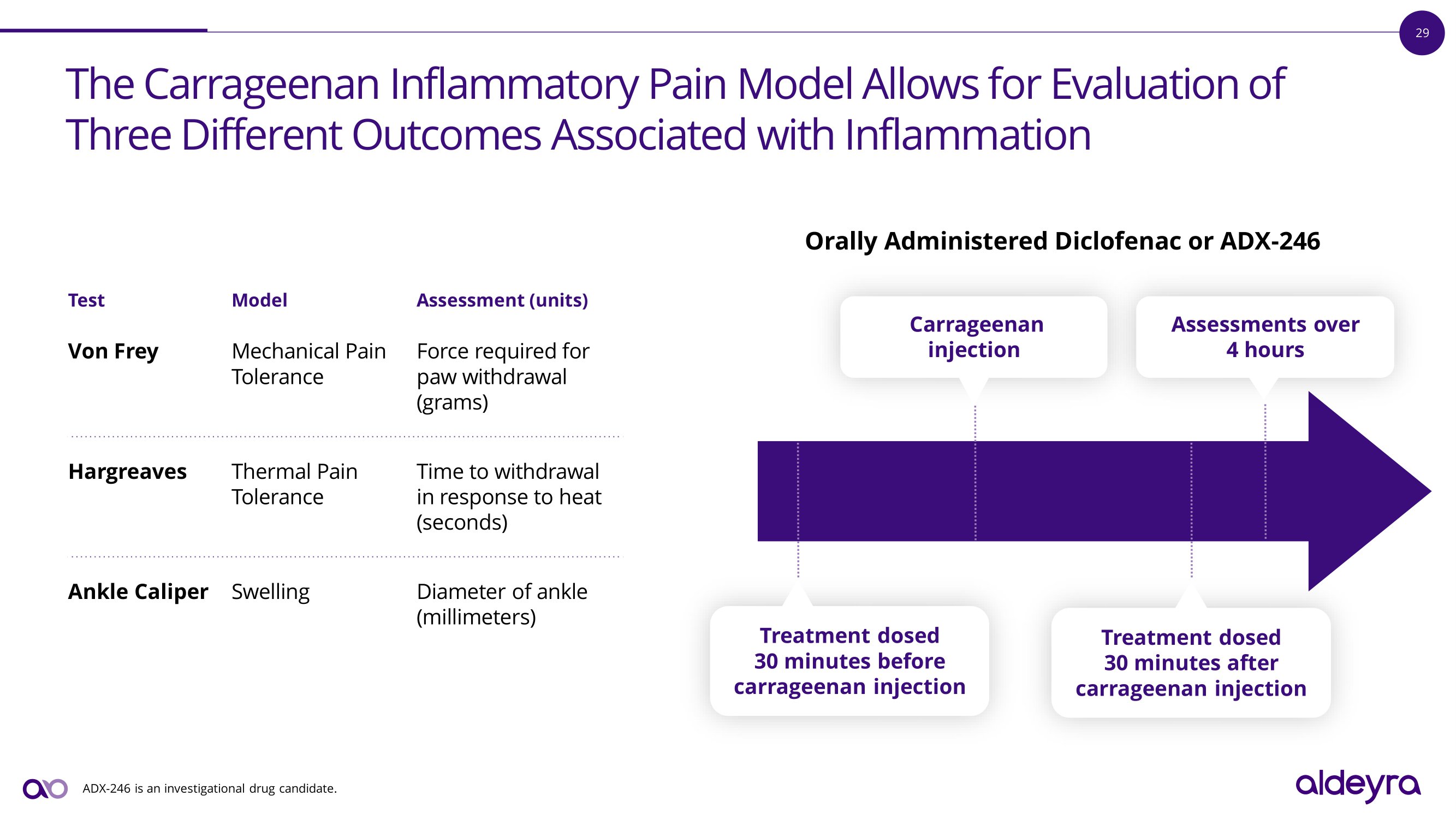 29 The Carrageenan Inflammatory Pain Model Allows for Evaluation of T h r e e D i ff e r e n t O u t c o m e s A ss o c i a t e d w i t h I n f l a mm a t i o n Orally Administered Diclofenac or ADX - 246 Assessment (units) Model Test Force required for paw withdrawal (grams) Mechanical Pain Tolerance Von Frey Time to withdrawal in response to heat (seconds) T he r m a l P a i n Tolerance Hargreaves Diameter of ankle (millimeters) Swelling Ankle Caliper Treatment dosed 30 minutes before carrageenan injection Assessments over 4 hours Carrageenan injection Treatment dosed 30 minutes after carrageenan injection ADX - 246 is an investigational drug candidate.