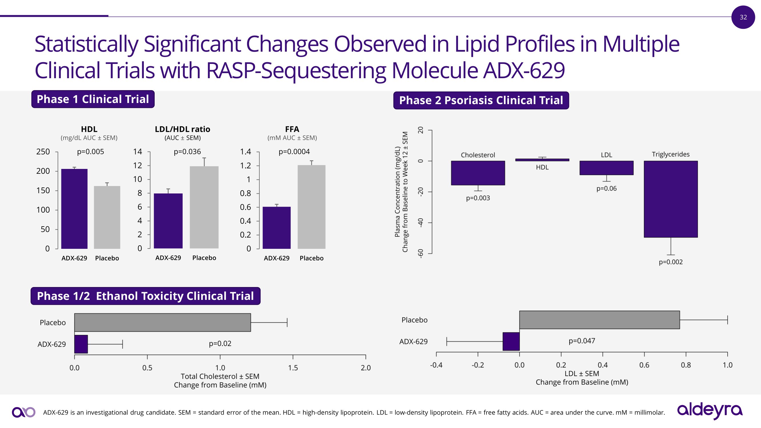 32 Statistically Significant Changes Observed in Lipid Profiles in Multiple Clinical Trials with RASP - Sequestering Molecule ADX - 629 250 200 150 100 50 0 ADX - 629 P l a c e b o 14 12 10 8 6 4 2 0 A D X - 629 P l a c e b o 1 . 4 1 . 2 1 0 . 8 0 . 6 0 . 4 0 . 2 0 ADX - 629 P l a c e b o HDL (mg/dL AUC “ SEM) p=0.005 L D L / H D L r a t i o (A UC “ S E M ) p=0.036 FFA (mM AUC “ SEM) p=0.0004 ADX - 629 is an investigational drug candidate. SEM = standard error of the mean. HDL = high - density lipoprotein. LDL = low - density lipoprotein. FFA = free fatty acids. AUC = area under the curve. mM = millimolar. Phase 1 Clinical Trial Phase 2 Psoriasis Clinical Trial Phase 1/2 Ethanol Toxicity Clinical Trial