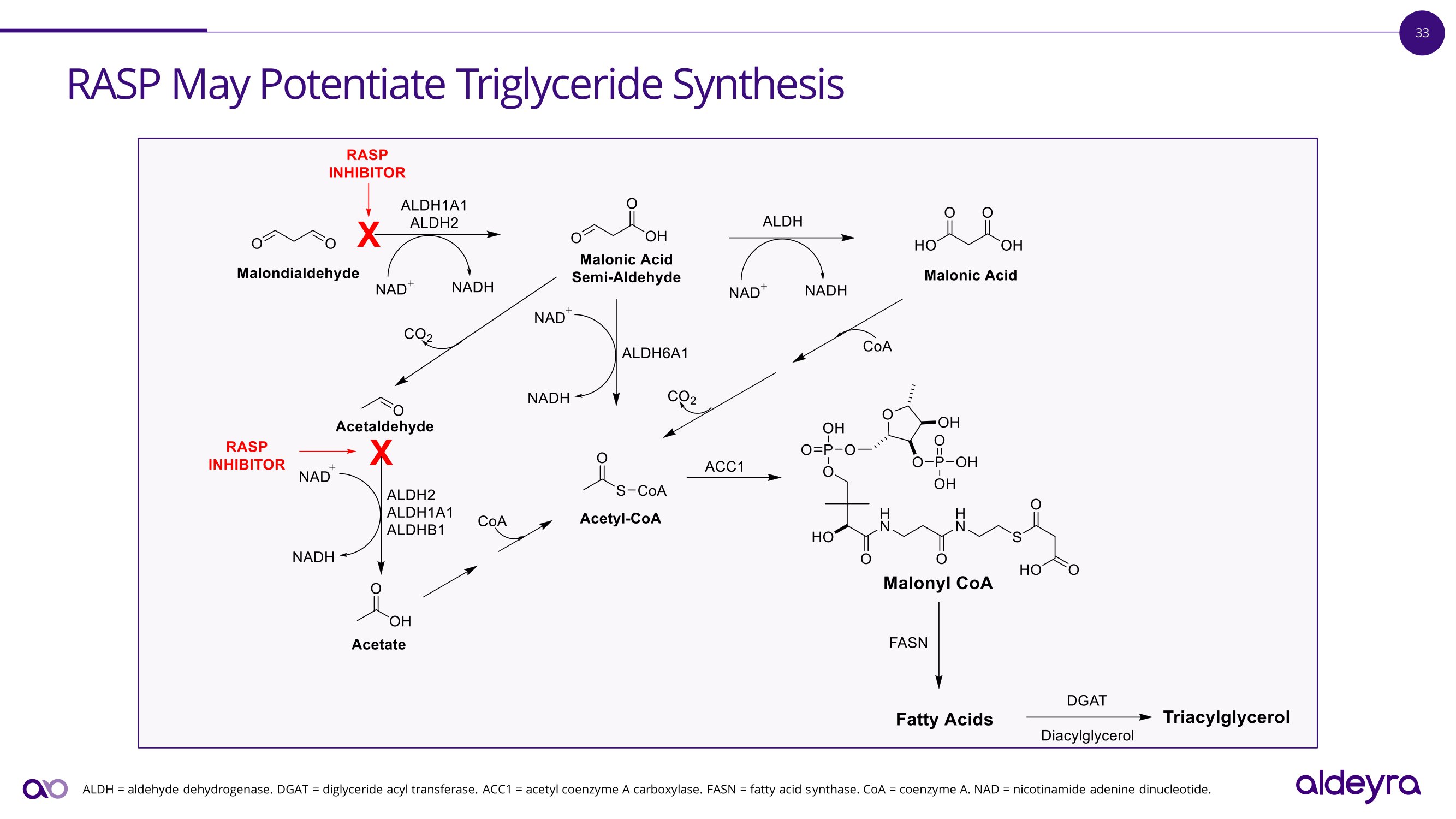 33 R A S P M a y P o t e n t i a t e T r i g l y c e r i d e S y n t h e s i s ALDH = aldehyde dehydrogenase. DGAT = diglyceride acyl transferase. ACC1 = acetyl coenzyme A carboxylase. FASN = fatty acid synthase. CoA = coenzyme A. NAD = nicotinamide adenine dinucleotide.
