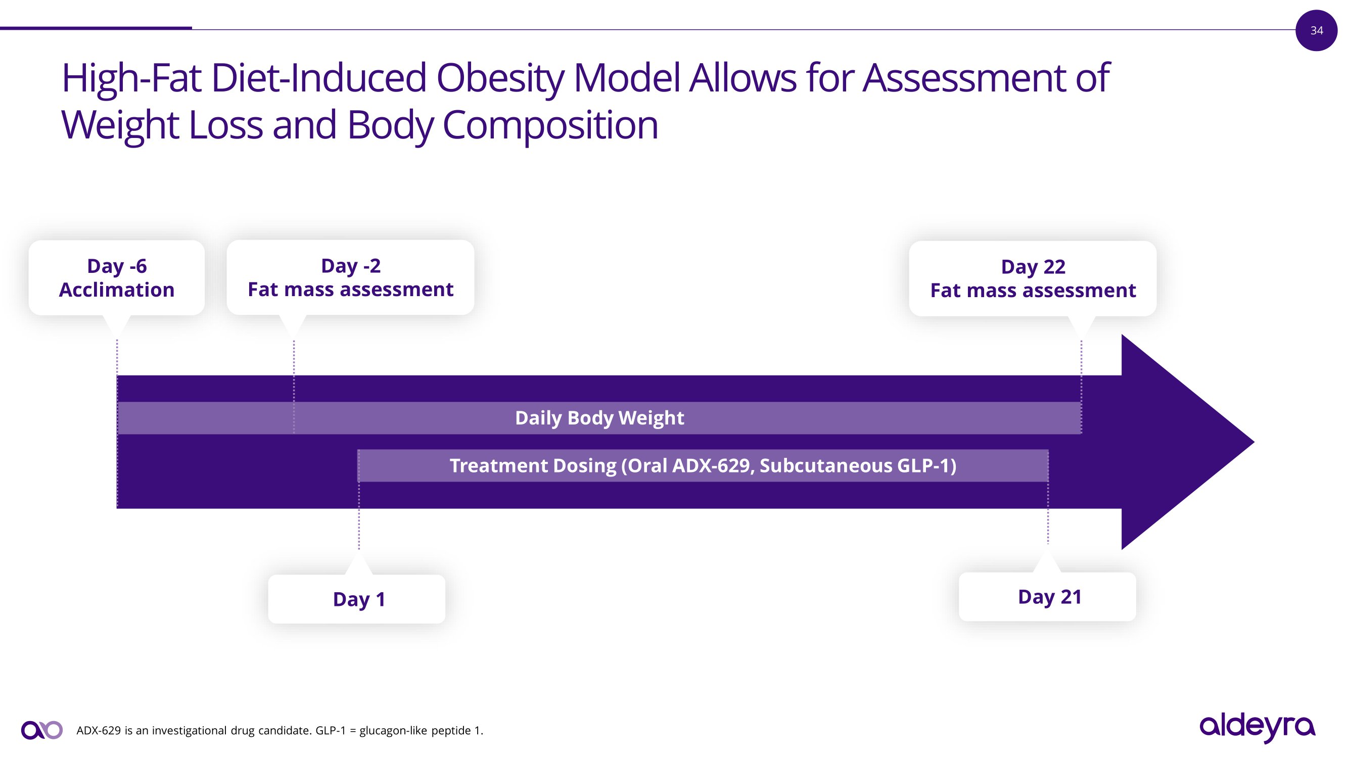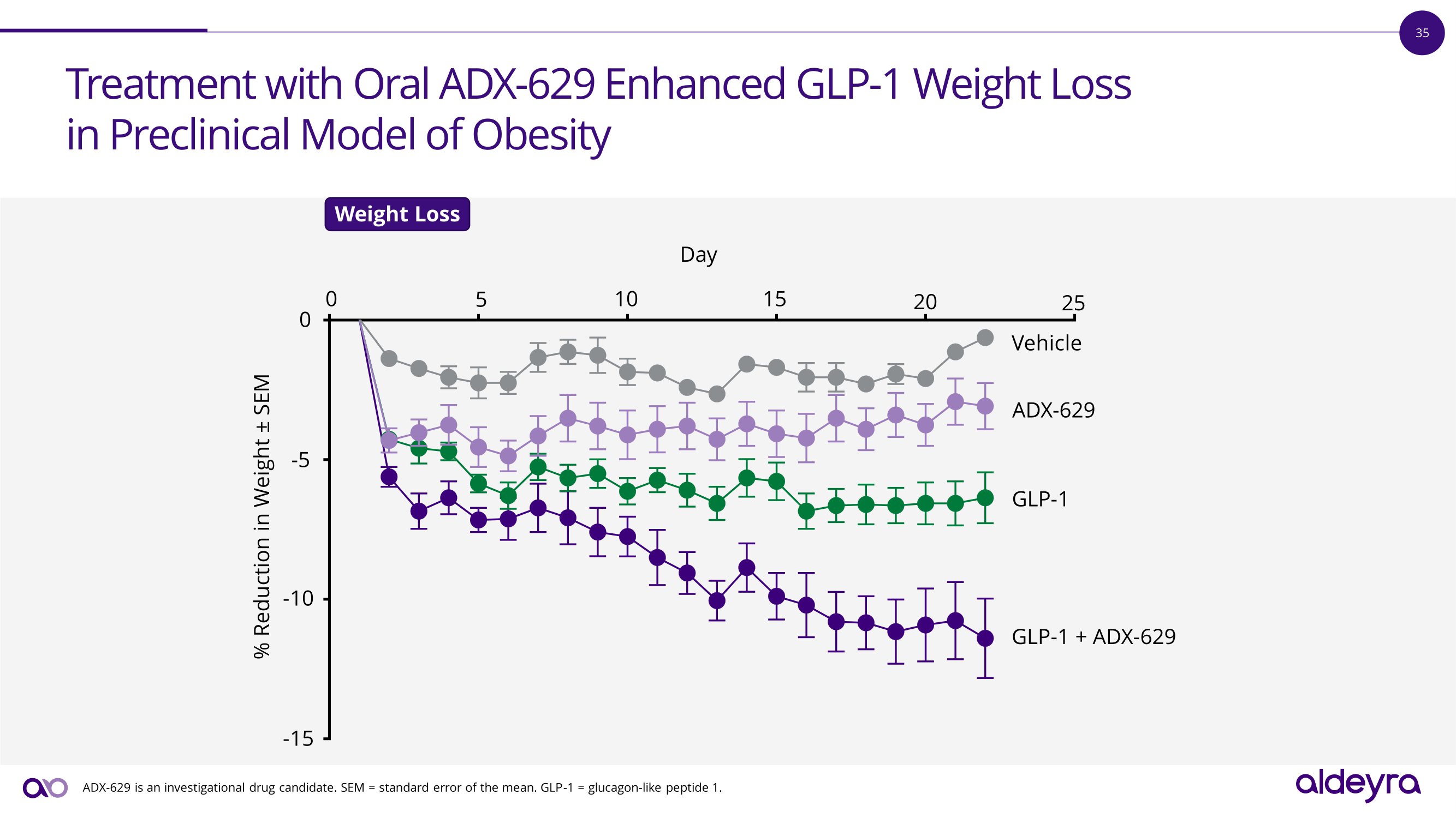 34 Day - 6 Ac c li matio n Day - 2 Fat mass assessment Day 1 Day 22 Fat mass assessment High - Fat Diet - Induced Obesity Model Allows for Assessment of Weight Loss and Body Composition Daily Body Weight Treatment Dosing (Oral ADX - 629, Subcutaneous GLP - 1) ADX - 629 is an investigational drug candidate. GLP - 1 = glucagon - like peptide 1. Day 21