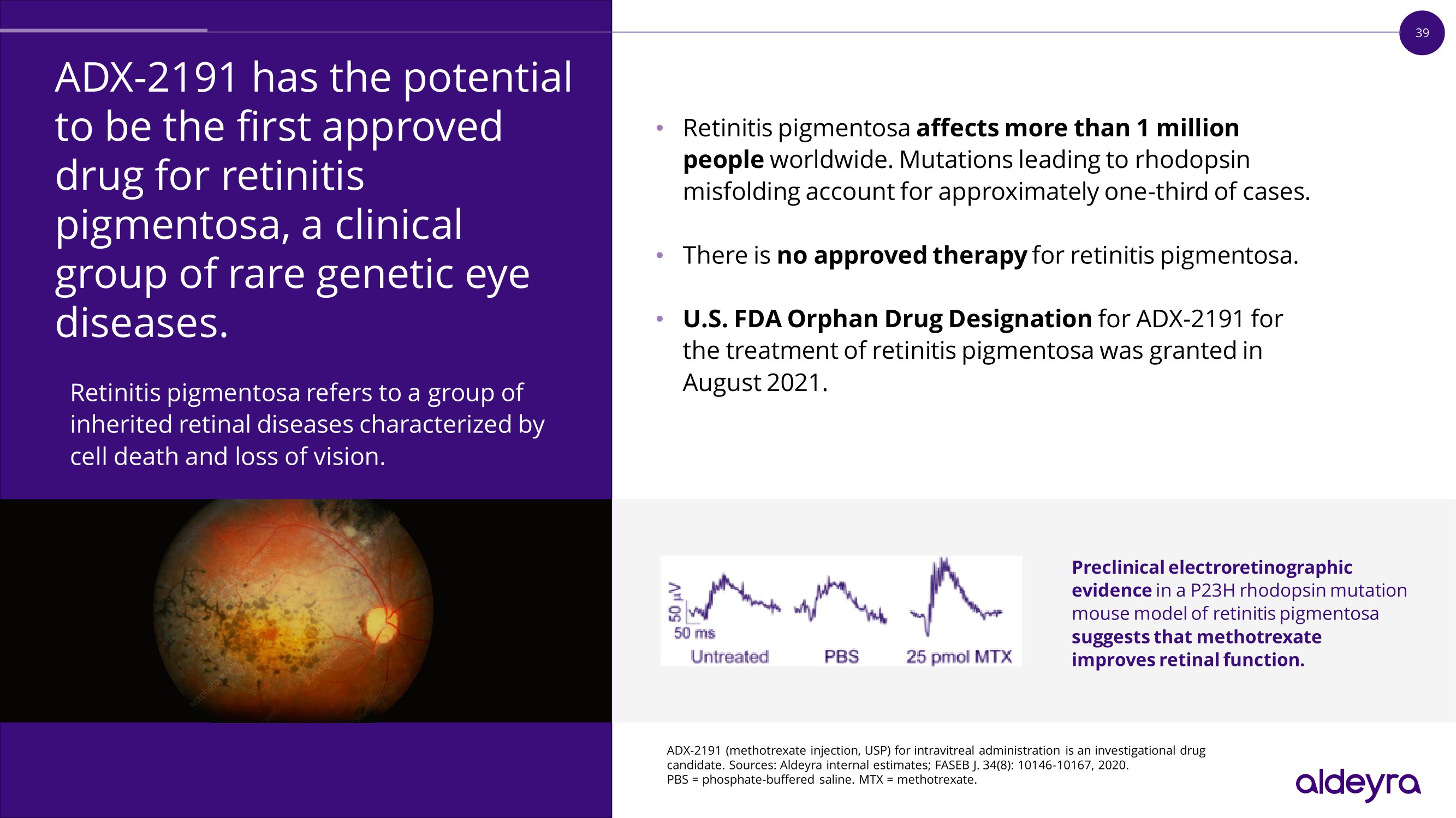 39 ADX - 2191 has the potential to be the first approved drug for retinitis pigmentosa, a clinical group of rare genetic eye diseases. Retinitis pigmentosa refers to a group of inherited retinal diseases characterized by cell death and loss of vision. • Retinitis pigmentosa affects more than 1 million p e o p l e w o r ldwi d e . M u t a t i o ns l e a di n g t o r h o d o p s i n misfolding account for approximately one - third of cases. • There is no approved therapy for retinitis pigmentosa. • U.S. FDA Orphan Drug Designation for ADX - 2191 for the treatment of retinitis pigmentosa was granted in A ugust 2021 . P r e c li n i c a l e l e c t r o r e t i n o g r a p h i c e v i d e n c e i n a P 2 3 H r h o d o p s i n m u t a t i o n m o u s e m o d el o f r e t i n i t i s p i g m en t o sa s u gg e s t s t h a t m e t h o t r e x a t e i mp r o v e s r e t i n a l fun c t i o n . ADX - 2191 (methotrexate injection, USP) for intravitreal administration is an investigational drug candidate. Sources: Aldeyra internal estimates; FASEB J. 34(8): 10146 - 10167, 2020. PBS = phosphate - buffered saline. MTX = methotrexate.
