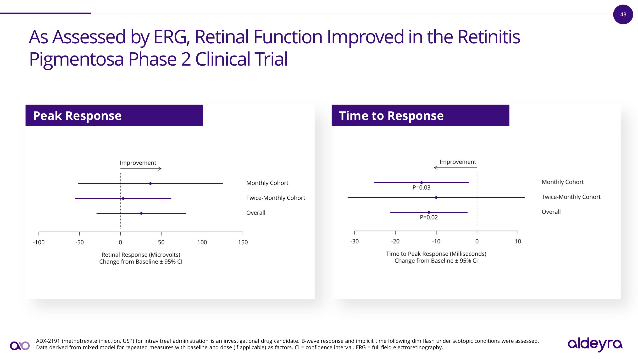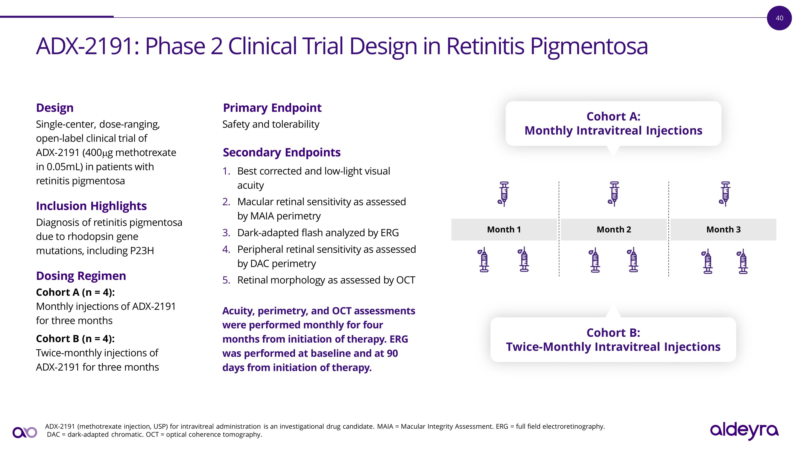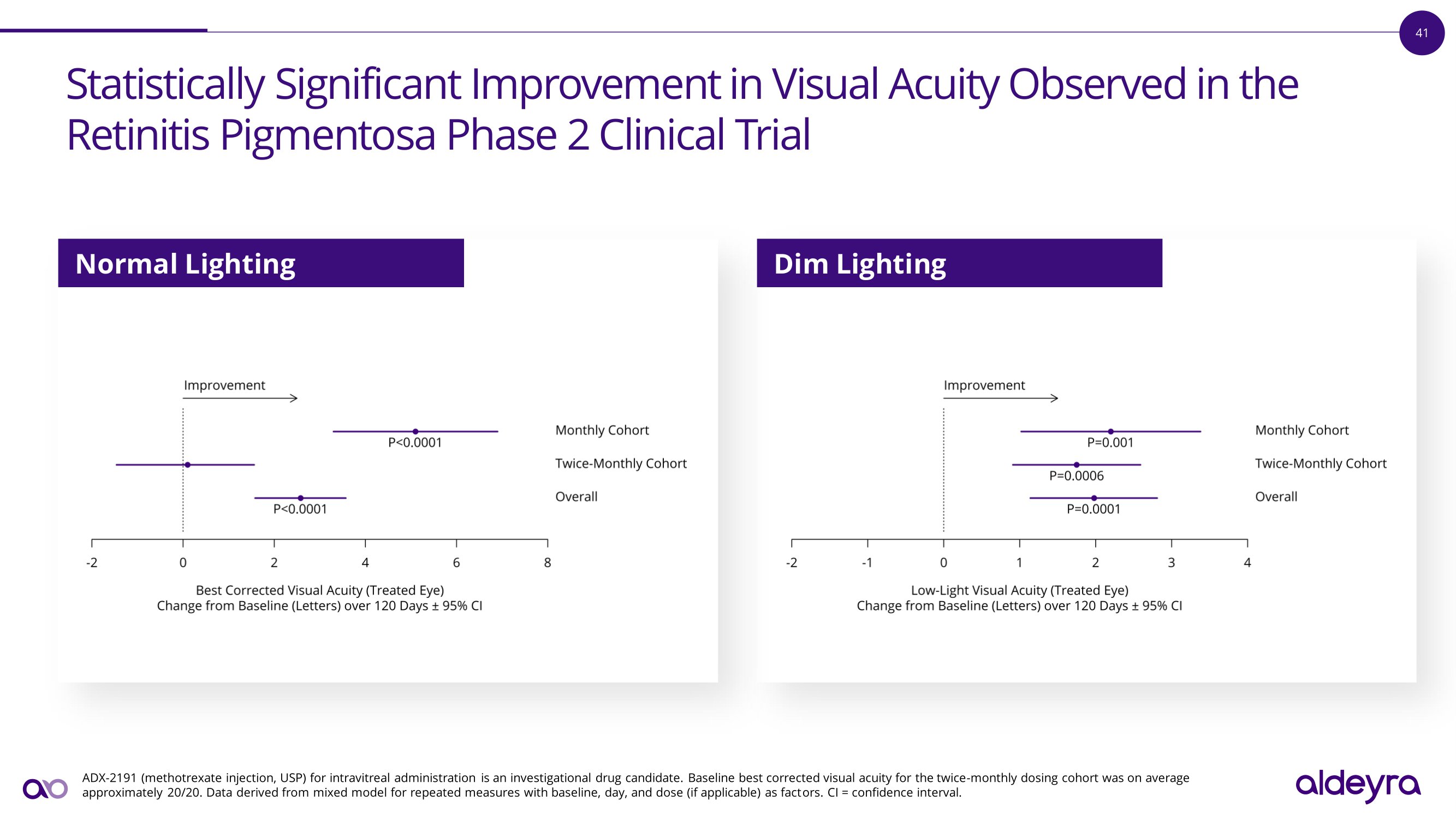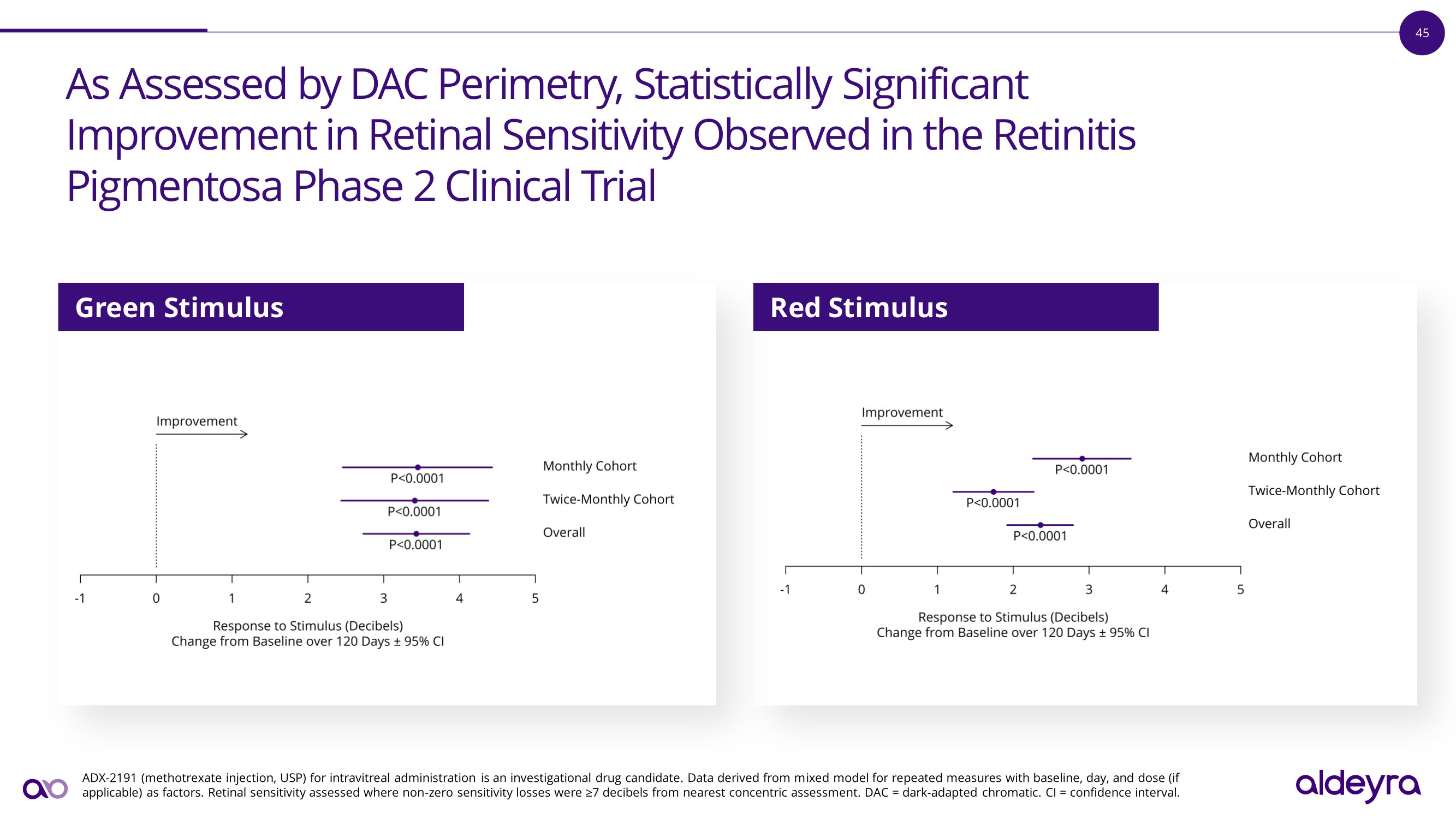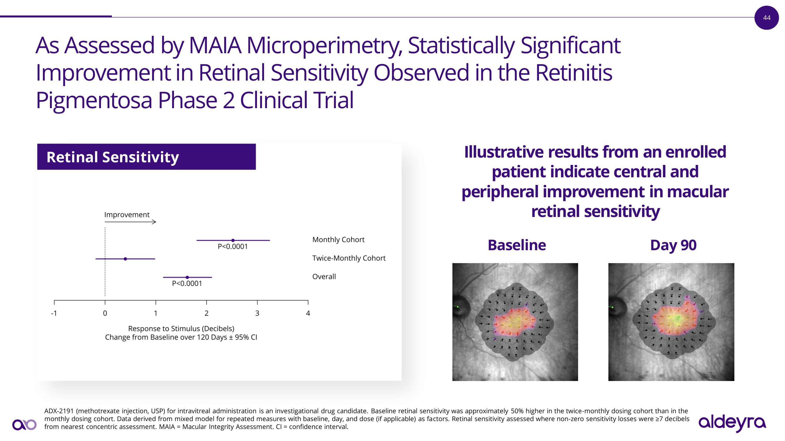 44 As Assessed by MAIA Microperimetry, Statistically Significant I m p r o v e m e n t i n R e t i n a l S e n s i t i v i t y O b s e r v e d i n t h e R e t i n i t i s Pigmentosa Phase 2 Clinical Trial ADX - 2191 (methotrexate injection, USP) for intravitreal administration is an investigational drug candidate . Baseline retinal sensitivity was approximately 50 % higher in the twice - monthly dosing cohort than in the monthly dosing cohort . Data derived from mixed model for repeated measures with baseline, day, and dose (if applicable) as factors . Retinal sensitivity assessed where non - zero sensitivity losses were ≥ 7 decibels from nearest concentric assessment . MAIA = Macular Integrity Assessment . CI = confidence interval . Retinal Sensitivity Illustrative results from an enrolled p a t i e n t i n d i c a t e c e n t r a l a n d p e r ip h e r a l i m p r o v e m e n t i n m a c u l a r retinal sensitivity B a s e li n e D a y 9 0