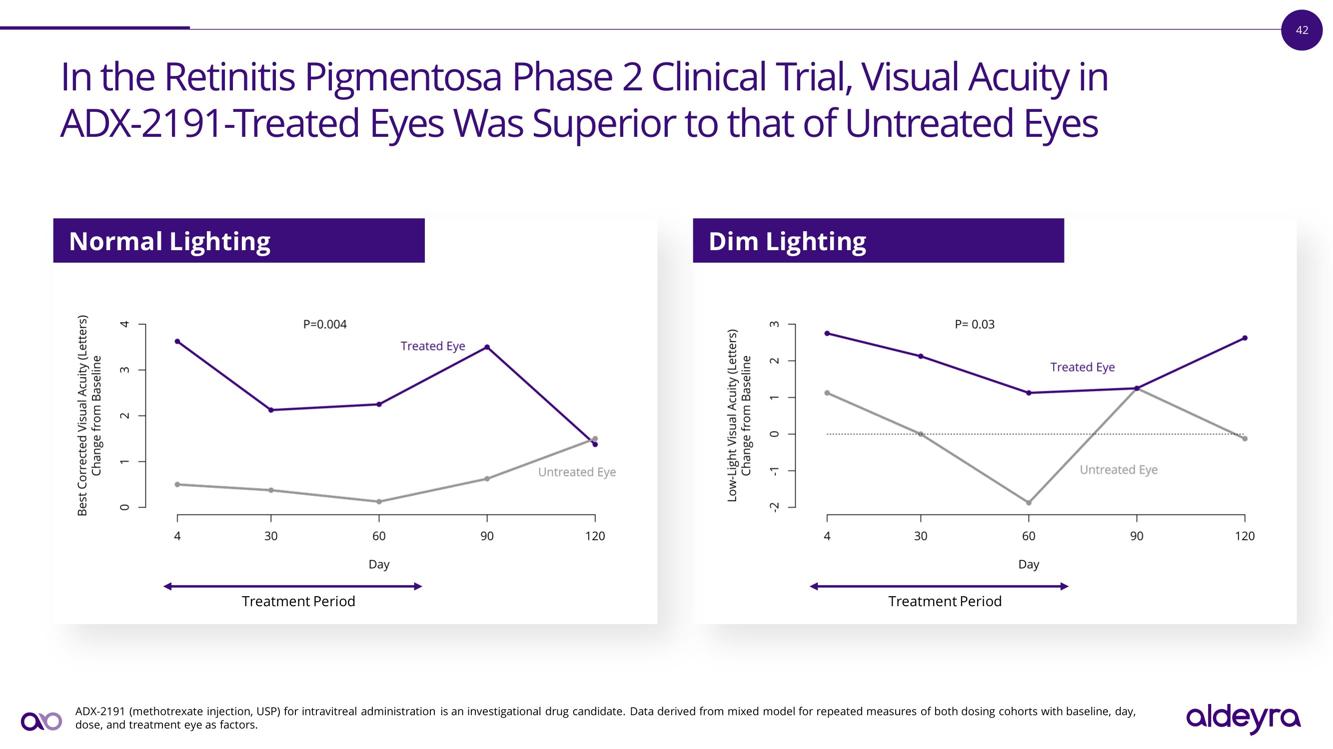 41 Statistically Significant Improvement in Visual Acuity Observed in the R e t i n i t i s P i g m e n t o s a P h a s e 2 C li n i c a l T r i a l ADX - 2191 (methotrexate injection, USP) for intravitreal administration is an investigational drug candidate. Baseline best corrected visual acuity for the twice - monthly dosing cohort was on average approximately 20/20. Data derived from mixed model for repeated measures with baseline, day, and dose (if applicable) as factors. CI = confidence interval. Normal Lighting Dim Lighting
