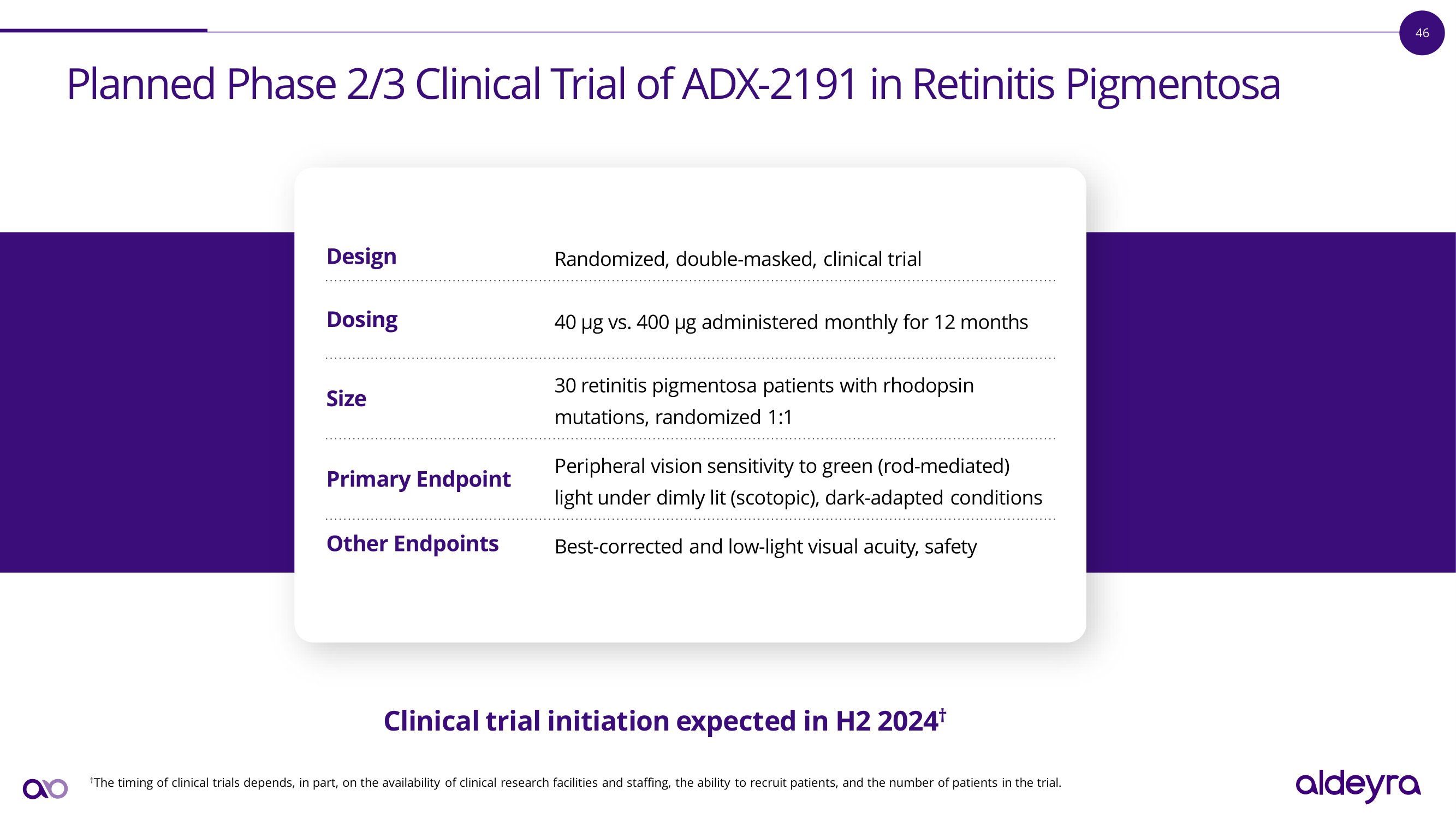 46 Planned Phase 2/3 Clinical Trial of ADX - 2191 in Retinitis Pigmentosa Randomized, double - masked, clinical trial Design 40 µg vs. 400 µg administered monthly for 12 months Dosing 30 retinitis pigmentosa patients with rhodopsin mutations, randomized 1:1 Size Peripheral vision sensitivity to green (rod - mediated) light under dimly lit (scotopic), dark - adapted conditions Primary Endpoint Best - corrected and low - light visual acuity, safety O t he r E n dp o in t s † The timing of clinical trials depends, in part, on the availability of clinical research facilities and staffing, the ability to recruit patients, and the number of patients in the trial. C li n i c a l t r i a l i n i t i a t i o n e xp e c t e d i n H 2 202 4 †