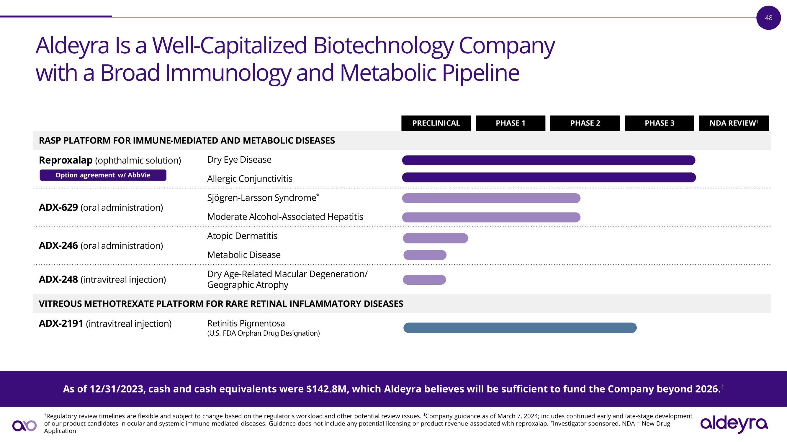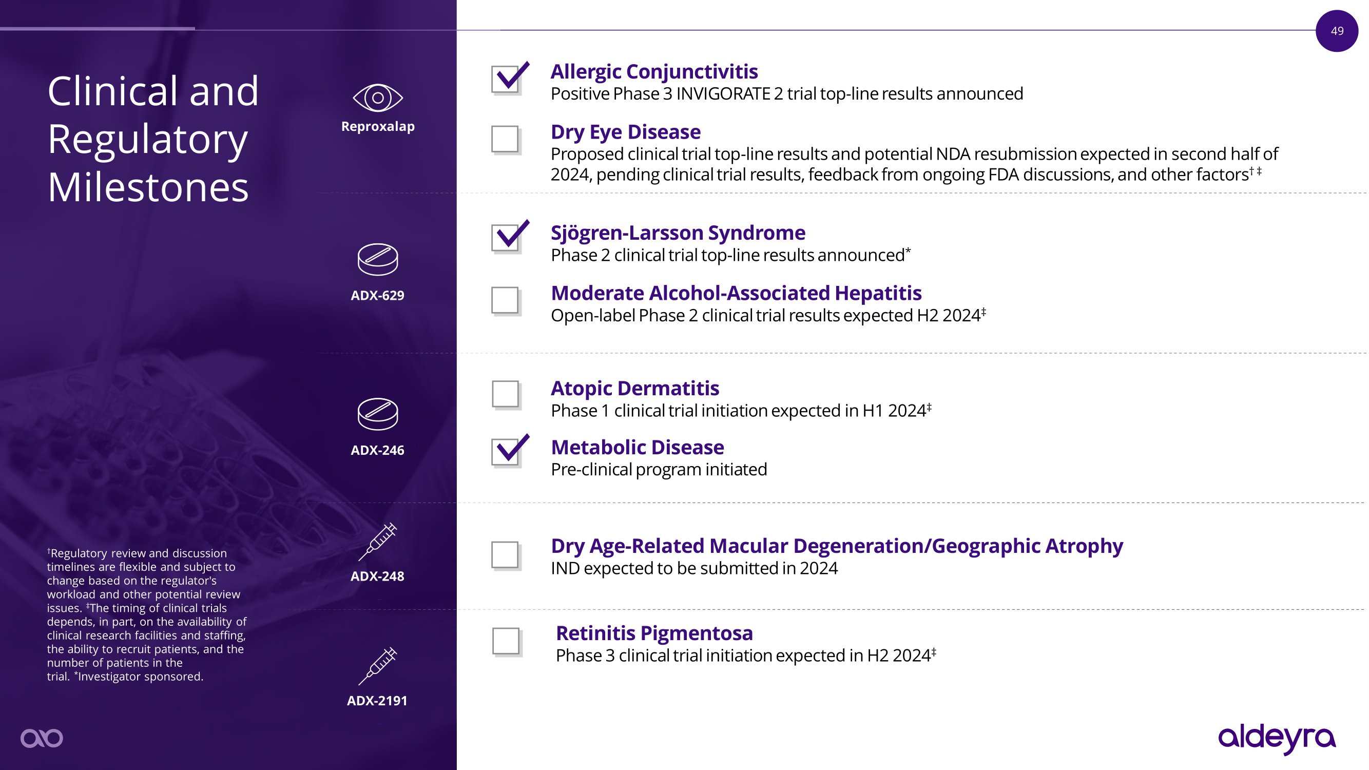 48 Aldeyra Is a Well - Capitalized Biotechnology Company w i t h a B r o a d I mm un o l o g y a n d M e t a b o li c P i p e li n e N D A RE VI E W † P H A SE 3 P H A SE 2 P HAS E 1 PRECLINICAL RASP PLATFORM FOR IMMUNE - MEDIATED AND METABOLIC DISEASES D r y E y e D i s ea s e A ll e r g i c C o n j un c t i v i t i s A D X - 62 9 ( o r a l a d m i n i s t r a t i on ) S j ö g r e n - L a r ss o n S y n d r o m e * Moderate Alcohol - Associated Hepatitis A D X - 24 6 ( o r a l a d m i n i s t r a t i on ) Atopic Dermatitis M e t a b o li c D i s ea s e A D X - 24 8 ( i n t r a v i t r ea l i n j e c t i on ) D r y A g e - R e l a t e d M a c u l a r D e g e n e r a t i on / Geographic Atrophy VITREOUS METHOTREXATE PLATFORM FOR RARE RETINAL INFLAMMATORY DISEASES A D X - 219 1 ( i n t r a v i t r ea l i n j e c t i on ) R e t ini t i s P ig m en t o s a ( U.S . F D A O rp h a n D r u g D e sig n a tio n ) † Regulatory review timelines are flexible and subject to change based on the regulator's workload and other potential review issues. ‡ Company guidance as of March 7, 2024; includes continued early and late - stage development of our product candidates in ocular and systemic immune - mediated diseases. Guidance does not include any potential licensing or product revenue associated with reproxalap. * Investigator sponsored. NDA = New Drug Application As of 12/31/2023, cash and cash equivalents were $142.8M, which Aldeyra believes will be sufficient to fund the Company beyond 2026. ‡ Reproxalap (ophthalmic solution) Option agreement w/ AbbVie