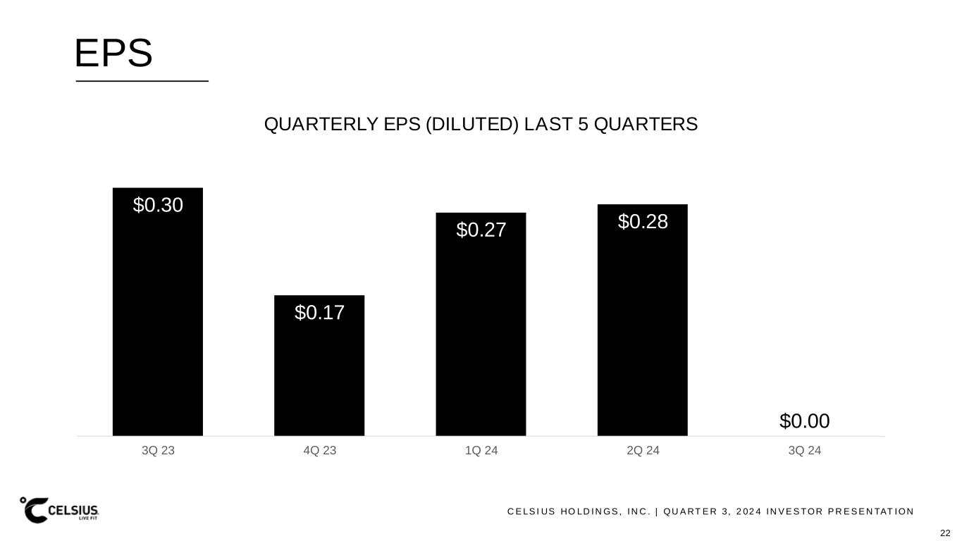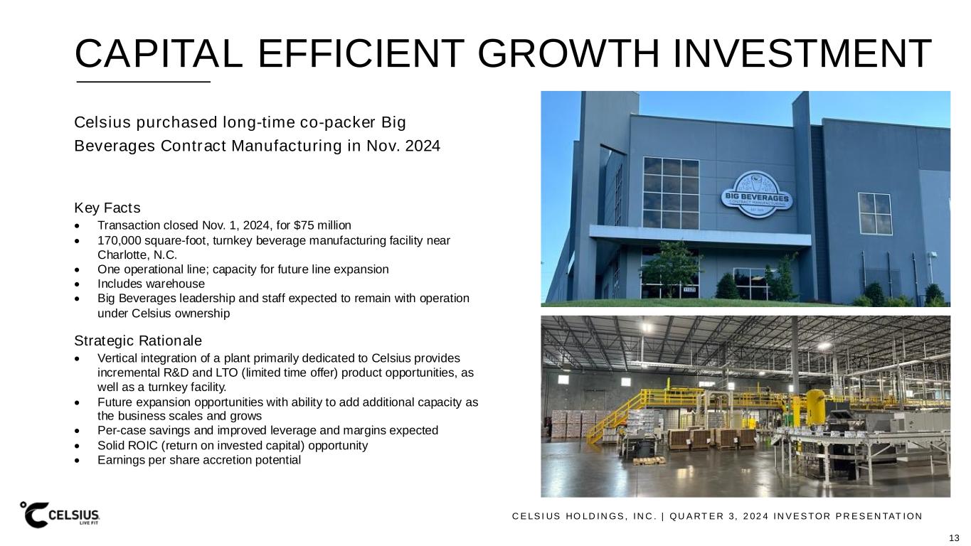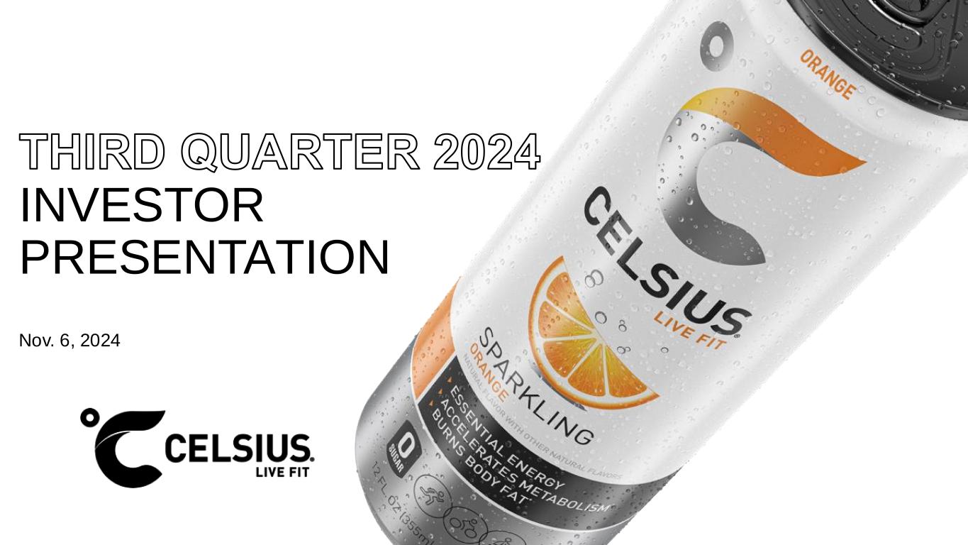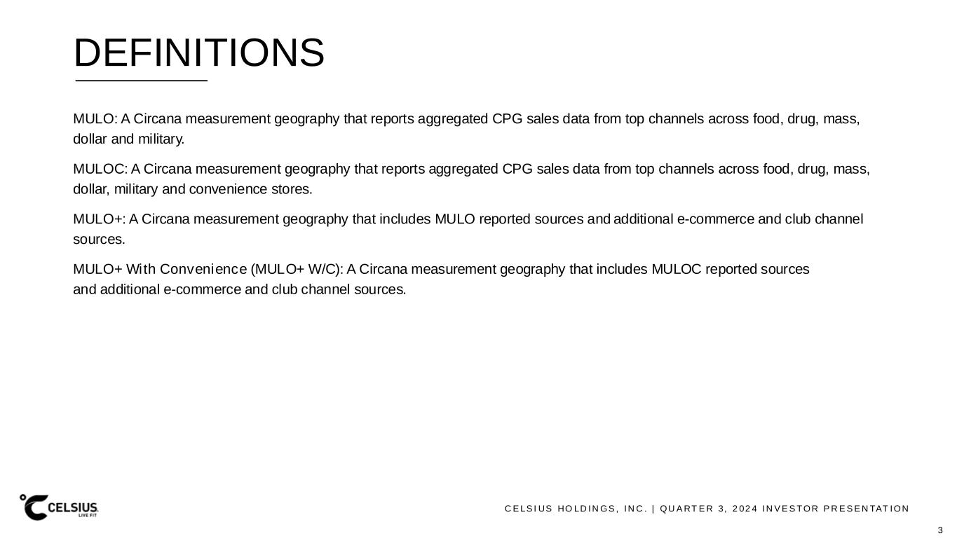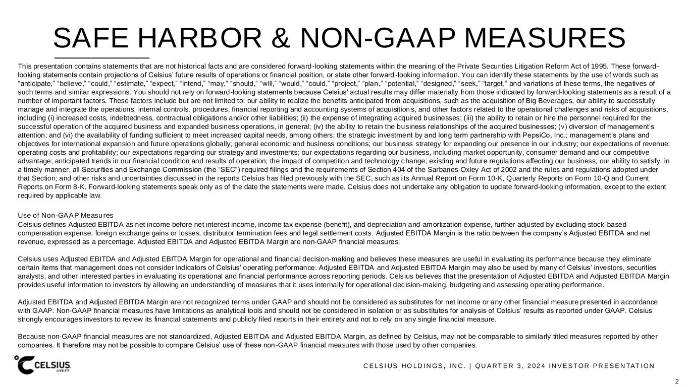 C E LS I US HO LD IN GS , IN C . | QU A RT E R 3, 2 02 4 IN V E S TOR P R E S E N TAT ION SAFE HARBOR & NON-GAAP MEASURES This presentation contains statements that are not historical facts and are considered forward-looking statements within the meaning of the Private Securities Litigation Reform Act of 1995. These forward- looking statements contain projections of Celsius’ future results of operations or financial position, or state other forward -looking information. You can identify these statements by the use of words such as “anticipate,” “believe,” “could,” “estimate,” “expect,” “intend,” “may,” “should,” “will,” “would,” “could,” “project,” “plan,” “potential,” “designed,” “seek,” “target,” and variations of these terms, the negatives of such terms and similar expressions. You should not rely on forward-looking statements because Celsius’ actual results may differ materially from those indicated by forward-looking statements as a result of a number of important factors. These factors include but are not limited to: our ability to realize the benefits anticipated from acquisitions, such as the acquisition of Big Beverages, our ability to successfully manage and integrate the operations, internal controls, procedures, financial reporting and accounting systems of acquisition s, and other factors related to the operational challenges and risks of acquisitions, including (i) increased costs, indebtedness, contractual obligations and/or other liabilities; (ii) the expense of integrating acquired businesses; (iii) the ability to retain or hire the personnel required for the successful operation of the acquired business and expanded business operations, in general; (iv) the ability to retain the business relationships of the acquired businesses; (v) diversion of management’s attention; and (vi) the availability of funding sufficient to meet increased capital needs, among others; the strategic investment by and long term partnership with PepsiCo, Inc.; management’s plans and objectives for international expansion and future operations globally; general economic and business conditions; our business strategy for expanding our presence in our industry; our expectations of revenue; operating costs and profitability; our expectations regarding our strategy and investments; our expectations regarding our business, including market opportunity, consumer demand and our competitive advantage; anticipated trends in our financial condition and results of operation; the impact of competition and technology change; existing and future regulations affecting our business; our ability to satisfy, in a timely manner, all Securities and Exchange Commission (the “SEC”) required filings and the requirements of Section 404 of the Sarbanes-Oxley Act of 2002 and the rules and regulations adopted under that Section; and other risks and uncertainties discussed in the reports Celsius has filed previously with the SEC, such as i ts Annual Report on Form 10-K, Quarterly Reports on Form 10-Q and Current Reports on Form 8-K. Forward-looking statements speak only as of the date the statements were made. Celsius does not undertake any obligation to update forward-looking information, except to the extent required by applicable law. Use of Non-GAAP Measures Celsius defines Adjusted EBITDA as net income before net interest income, income tax expense (benefit), and depreciation and amortization expense, further adjusted by excluding stock-based compensation expense, foreign exchange gains or losses, distributor termination fees and legal settlement costs. Adjusted EBITDA Margin is the ratio between the company’s Adjusted EBITDA and net revenue, expressed as a percentage. Adjusted EBITDA and Adjusted EBITDA Margin are non-GAAP financial measures. Celsius uses Adjusted EBITDA and Adjusted EBITDA Margin for operational and financial decision-making and believes these measures are useful in evaluating its performance because they eliminate certain items that management does not consider indicators of Celsius’ operating performance. Adjusted EBITDA and Adjusted EBITDA Margin may also be used by many of Celsius’ investors, securities analysts, and other interested parties in evaluating its operational and financial performance across reporting periods. Cels ius believes that the presentation of Adjusted EBITDA and Adjusted EBITDA Margin provides useful information to investors by allowing an understanding of measures that it uses internally for operational dec ision-making, budgeting and assessing operating performance. Adjusted EBITDA and Adjusted EBITDA Margin are not recognized terms under GAAP and should not be considered as substitutes for net income or any other financial measure presented in accordance with GAAP. Non-GAAP financial measures have limitations as analytical tools and should not be considered in isolation or as subs titutes for analysis of Celsius’ results as reported under GAAP. Celsius strongly encourages investors to review its financial statements and publicly filed reports in their entirety and not to rely on any single financial measure. Because non-GAAP financial measures are not standardized, Adjusted EBITDA and Adjusted EBITDA Margin, as defined by Celsius, may not be comparable to similarly titled measures reported by other companies. It therefore may not be possible to compare Celsius’ use of these non -GAAP financial measures with those used by other companies. 2