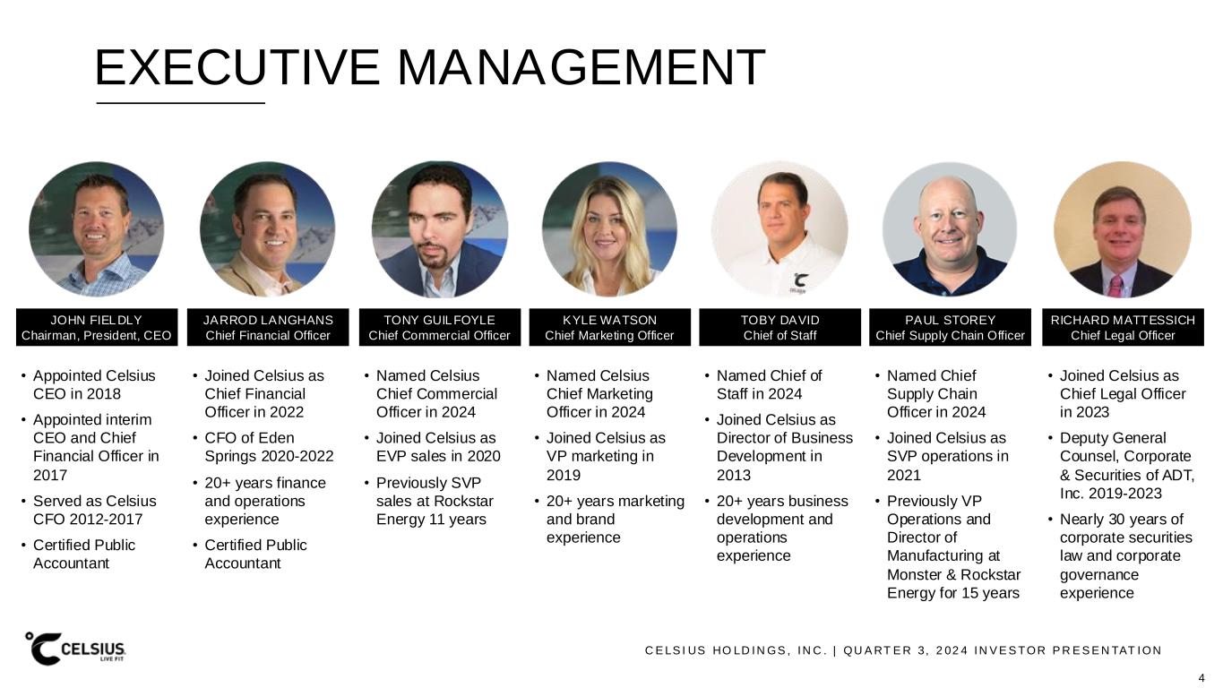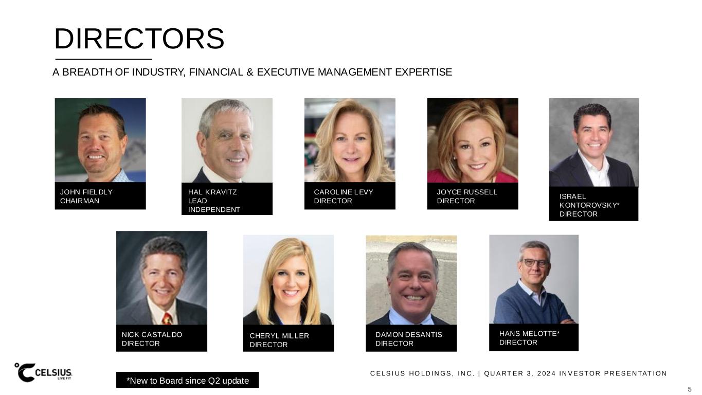 C E LS I US HO LD IN GS , IN C . | QU A RT E R 3, 2 02 4 IN V E S TOR P R E S E N TAT ION EXECUTIVE MANAGEMENT JOHN FIELDLY Chairman, President, CEO • Appointed Celsius CEO in 2018 • Appointed interim CEO and Chief Financial Officer in 2017 • Served as Celsius CFO 2012-2017 • Certified Public Accountant JARROD LANGHANS Chief Financial Officer • Joined Celsius as Chief Financial Officer in 2022 • CFO of Eden Springs 2020-2022 • 20+ years finance and operations experience • Certified Public Accountant TONY GUILFOYLE Chief Commercial Officer • Named Celsius Chief Commercial Officer in 2024 • Joined Celsius as EVP sales in 2020 • Previously SVP sales at Rockstar Energy 11 years KYLE WATSON Chief Marketing Officer • Named Celsius Chief Marketing Officer in 2024 • Joined Celsius as VP marketing in 2019 • 20+ years marketing and brand experience TOBY DAVID Chief of Staff • Named Chief of Staff in 2024 • Joined Celsius as Director of Business Development in 2013 • 20+ years business development and operations experience PAUL STOREY Chief Supply Chain Officer • Named Chief Supply Chain Officer in 2024 • Joined Celsius as SVP operations in 2021 • Previously VP Operations and Director of Manufacturing at Monster & Rockstar Energy for 15 years RICHARD MATTESSICH Chief Legal Officer • Joined Celsius as Chief Legal Officer in 2023 • Deputy General Counsel, Corporate & Securities of ADT, Inc. 2019-2023 • Nearly 30 years of corporate securities law and corporate governance experience 4