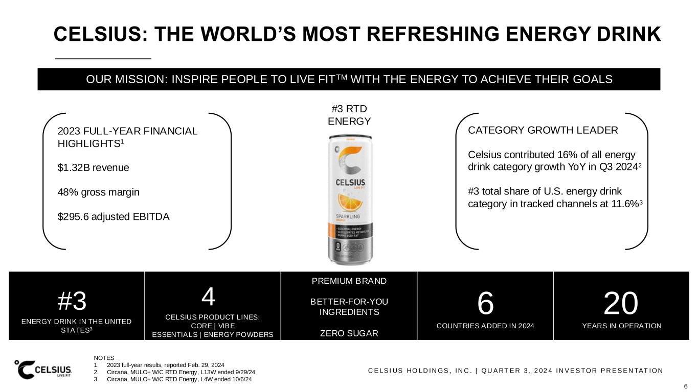 C E LS I US HO LD IN GS , IN C . | QU A RT E R 3, 2 02 4 IN V E S TOR P R E S E N TAT ION CELSIUS: THE WORLD’S MOST REFRESHING ENERGY DRINK OUR MISSION: INSPIRE PEOPLE TO LIVE FITTM WITH THE ENERGY TO ACHIEVE THEIR GOALS #3 ENERGY DRINK IN THE UNITED STATES3 4 CELSIUS PRODUCT LINES: CORE | VIBE ESSENTIALS | ENERGY POWDERS PREMIUM BRAND BETTER-FOR-YOU INGREDIENTS ZERO SUGAR 6 COUNTRIES ADDED IN 2024 20 YEARS IN OPERATION NOTES 1. 2023 full-year results, reported Feb. 29, 2024 2. Circana, MULO+ W/C RTD Energy, L13W ended 9/29/24 3. Circana, MULO+ W/C RTD Energy, L4W ended 10/6/24 #3 RTD ENERGY 2023 FULL-YEAR FINANCIAL HIGHLIGHTS1 $1.32B revenue 48% gross margin $295.6 adjusted EBITDA CATEGORY GROWTH LEADER Celsius contributed 16% of all energy drink category growth YoY in Q3 20242 #3 total share of U.S. energy drink category in tracked channels at 11.6%3 6
