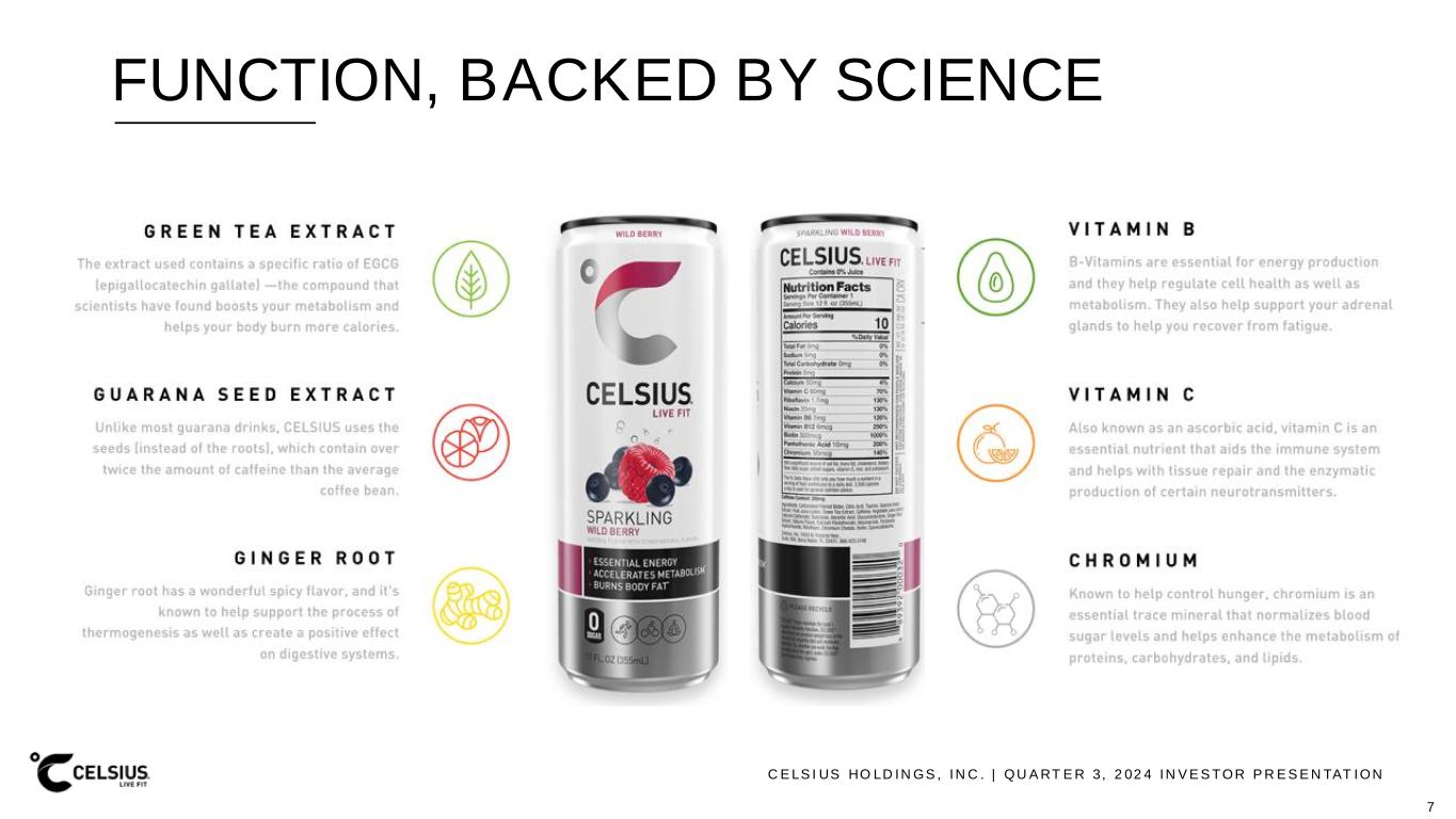 C E LS I US HO LD IN GS , IN C . | QU A RT E R 3, 2 02 4 IN V E S TOR P R E S E N TAT ION FUNCTION, BACKED BY SCIENCE 7