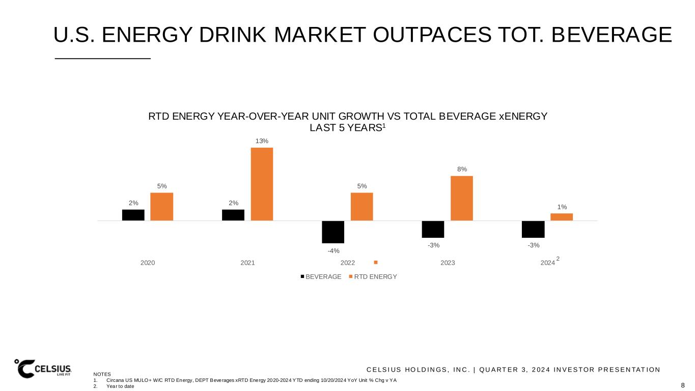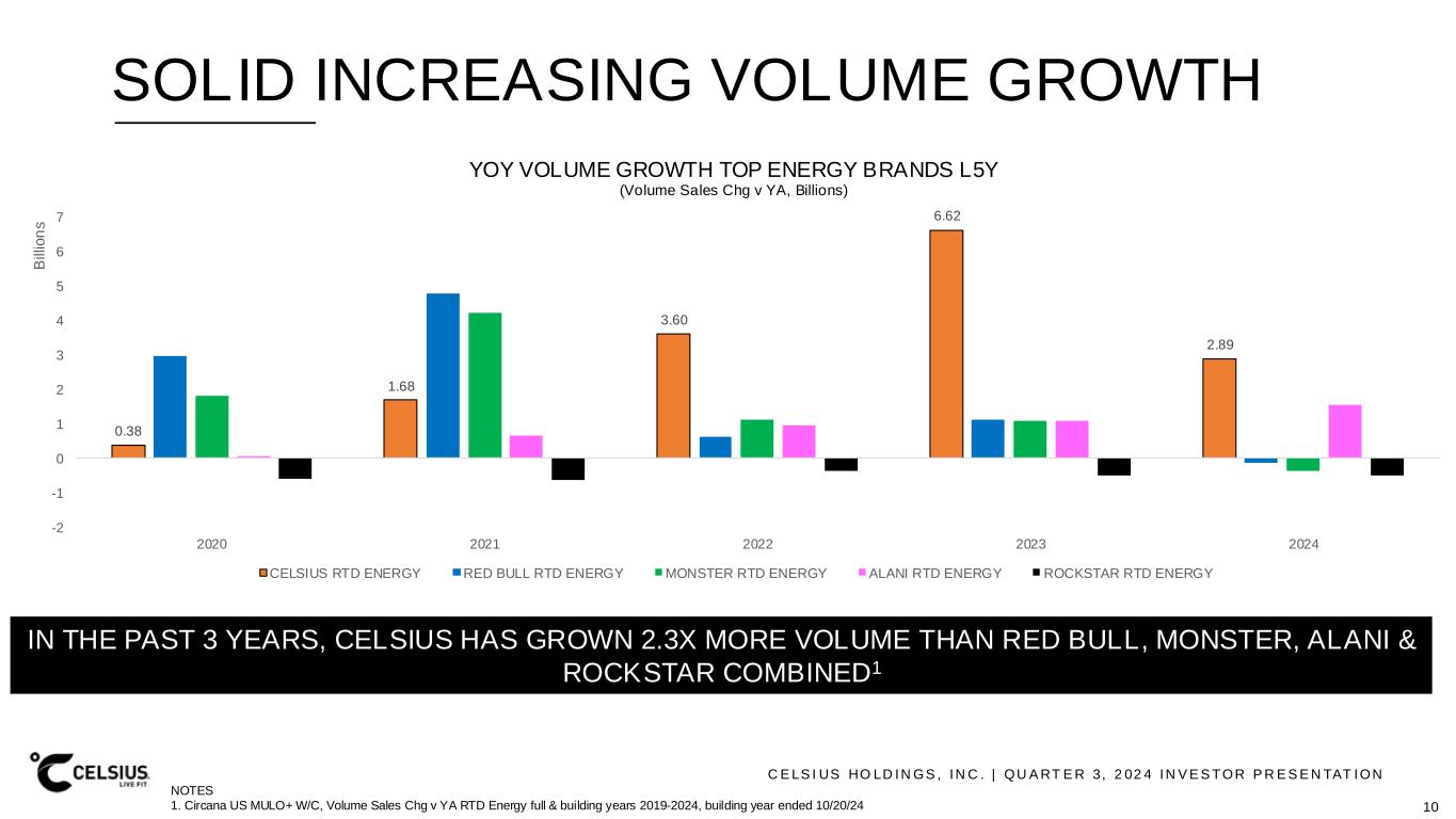 C E LS I US HO LD IN GS , IN C . | QU A RT E R 3, 2 02 4 IN V E S TOR P R E S E N TAT ION SOLID INCREASING VOLUME GROWTH 0.38 1.68 3.60 6.62 2.89 -2 -1 0 1 2 3 4 5 6 7 2020 2021 2022 2023 2024 B ill io n s YOY VOLUME GROWTH TOP ENERGY BRANDS L5Y (Volume Sales Chg v YA, Billions) CELSIUS RTD ENERGY RED BULL RTD ENERGY MONSTER RTD ENERGY ALANI RTD ENERGY ROCKSTAR RTD ENERGY IN THE PAST 3 YEARS, CELSIUS HAS GROWN 2.3X MORE VOLUME THAN RED BULL, MONSTER, ALANI & ROCKSTAR COMBINED1 NOTES 1. Circana US MULO+ W/C, Volume Sales Chg v YA RTD Energy full & building years 2019-2024, building year ended 10/20/24 10
