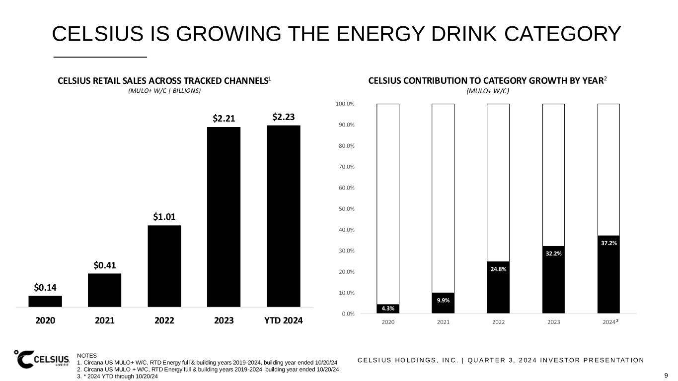 C E LS I US HO LD IN GS , IN C . | QU A RT E R 3, 2 02 4 IN V E S TOR P R E S E N TAT ION 2% 2% -4% -3% -3% 5% 13% 5% 8% 1% 2020 2021 2022 2023 2024 RTD ENERGY YEAR-OVER-YEAR UNIT GROWTH VS TOTAL BEVERAGE xENERGY LAST 5 YEARS1 BEVERAGE RTD ENERGY U.S. ENERGY DRINK MARKET OUTPACES TOT. BEVERAGE NOTES 1. Circana US MULO+ W/C RTD Energy, DEPT Beverages xRTD Energy 2020-2024 YTD ending 10/20/2024 YoY Unit % Chg v YA 2. Year to date 8 2