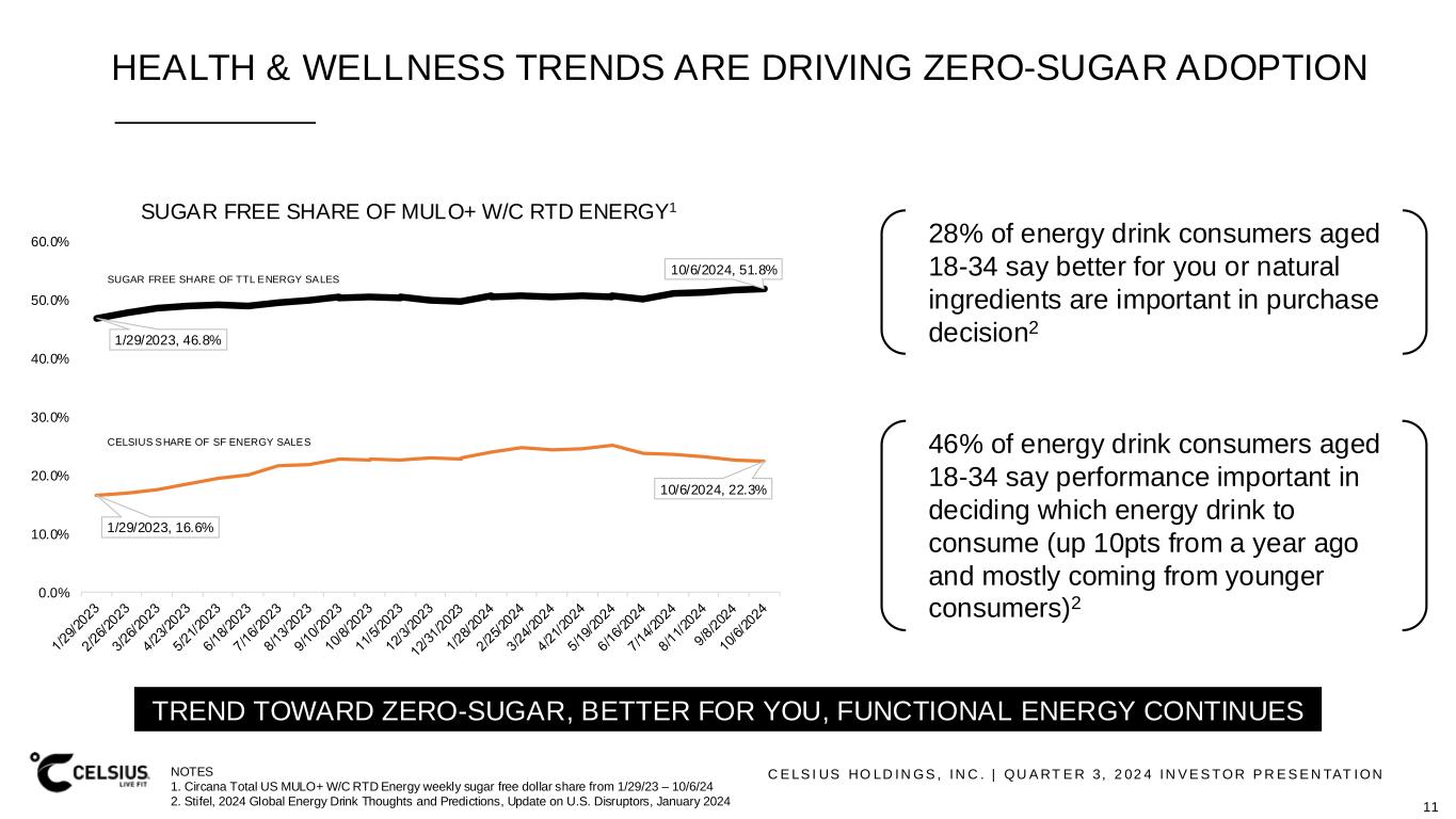 C E LS I US HO LD IN GS , IN C . | QU A RT E R 3, 2 02 4 IN V E S TOR P R E S E N TAT ION HEALTH & WELLNESS TRENDS ARE DRIVING ZERO-SUGAR ADOPTION TREND TOWARD ZERO-SUGAR, BETTER FOR YOU, FUNCTIONAL ENERGY CONTINUES NOTES 1. Circana Total US MULO+ W/C RTD Energy weekly sugar free dollar share from 1/29/23 – 10/6/24 2. Stifel, 2024 Global Energy Drink Thoughts and Predictions, Update on U.S. Disruptors, January 2024 28% of energy drink consumers aged 18-34 say better for you or natural ingredients are important in purchase decision2 46% of energy drink consumers aged 18-34 say performance important in deciding which energy drink to consume (up 10pts from a year ago and mostly coming from younger consumers)2 11 1/29/2023, 46.8% 10/6/2024, 51.8% 1/29/2023, 16.6% 10/6/2024, 22.3% 0.0% 10.0% 20.0% 30.0% 40.0% 50.0% 60.0% SUGAR FREE SHARE OF MULO+ W/C RTD ENERGY1 SUGAR FREE SHARE OF TTL ENERGY SALES CELSIUS SHARE OF SF ENERGY SALES