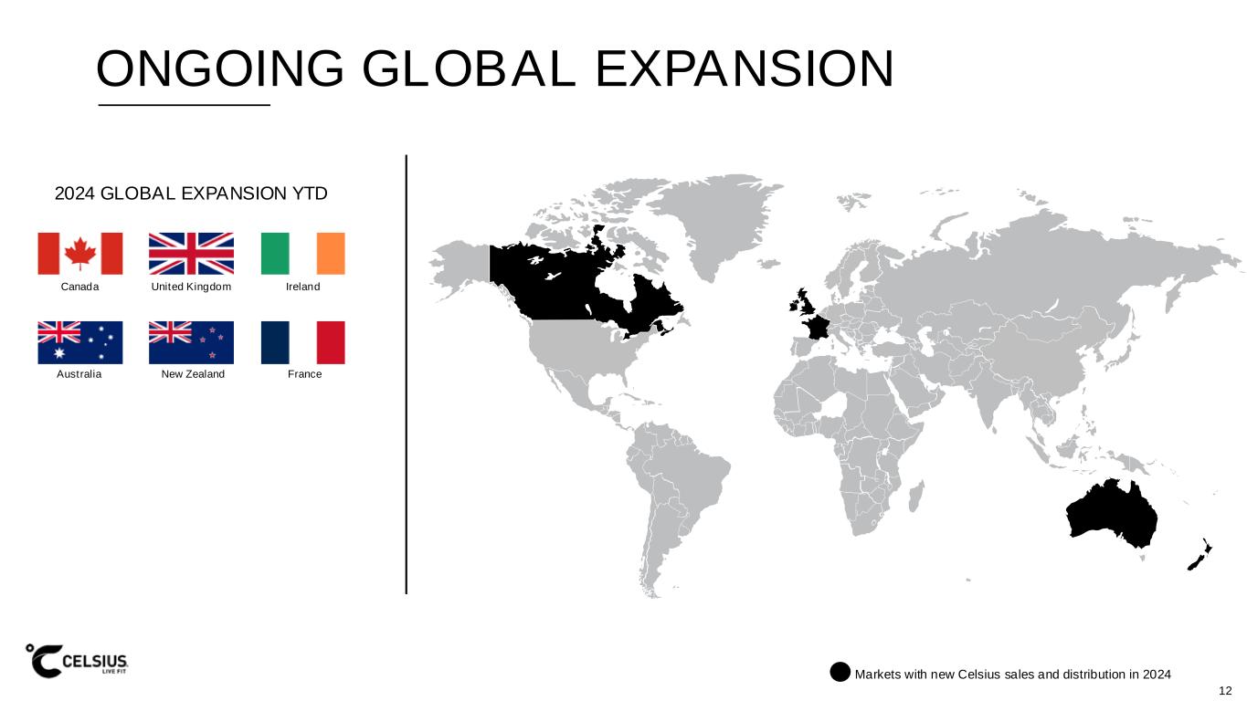 C E LS I US HO LD IN GS , IN C . | QU A RT E R 3, 2 02 4 IN V E S TOR P R E S E N TAT ION ONGOING GLOBAL EXPANSION Markets with new Celsius sales and distribution in 2024 12 2024 GLOBAL EXPANSION YTD Canada United Kingdom Ireland Australia New Zealand France