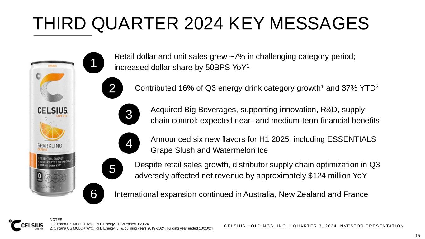 C E LS I US HO LD IN GS , IN C . | QU A RT E R 3, 2 02 4 IN V E S TOR P R E S E N TAT ION THIRD QUARTER 2024 KEY MESSAGES 1 Retail dollar and unit sales grew ~7% in challenging category period; increased dollar share by 50BPS YoY1 2 Contributed 16% of Q3 energy drink category growth1 and 37% YTD2 3 Acquired Big Beverages, supporting innovation, R&D, supply chain control; expected near- and medium-term financial benefits 6 International expansion continued in Australia, New Zealand and France 5 Despite retail sales growth, distributor supply chain optimization in Q3 adversely affected net revenue by approximately $124 million YoY 4 Announced six new flavors for H1 2025, including ESSENTIALS Grape Slush and Watermelon Ice 15 NOTES 1. Circana US MULO+ W/C, RTD Energy L13W ended 9/29/24 2. Circana US MULO+ W/C, RTD Energy full & building years 2019-2024, building year ended 10/20/24